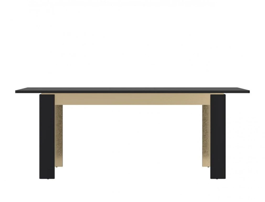 Rozkładany, czarny stół ze złotymi elementami doskonale komponuje się z eleganckimi krzesłami tapicerowanymi oraz krzesłami, których siedziska i oparcia pokryte są skórą ekologiczną bądź naturalną. Doskonale prezentujący się na co dzień stół przy szczególnych okazjach zapewnia swobodę biesiadowania dla całej rodziny. Znakomicie wpisuje się w wystrój nowoczesny, glamour i eklektyczny.