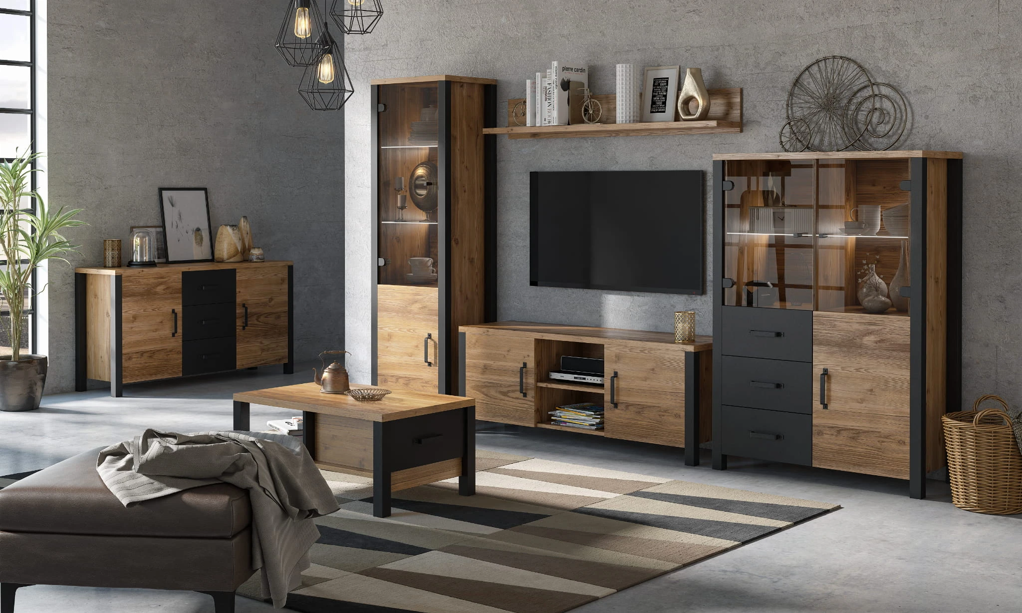 Kolekcja OLIN została zaprojektowana została z myślą o salonie i pokoju dziennym. Kolorystyczny duet drewna z czernią wkomponuje się idealnie w pomieszczenie loftowe i industrialne.
