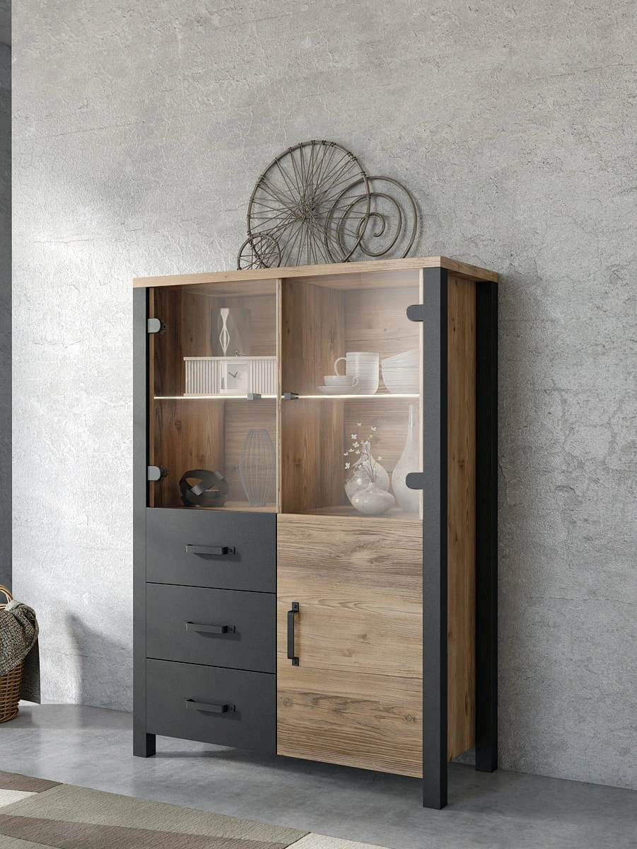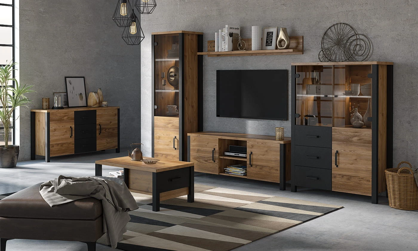 Kolekcja OLIN została zaprojektowana została z myślą o salonie i pokoju dziennym. Kolorystyczny duet drewna z czernią wkomponuje się idealnie w pomieszczenie loftowe i industrialne.