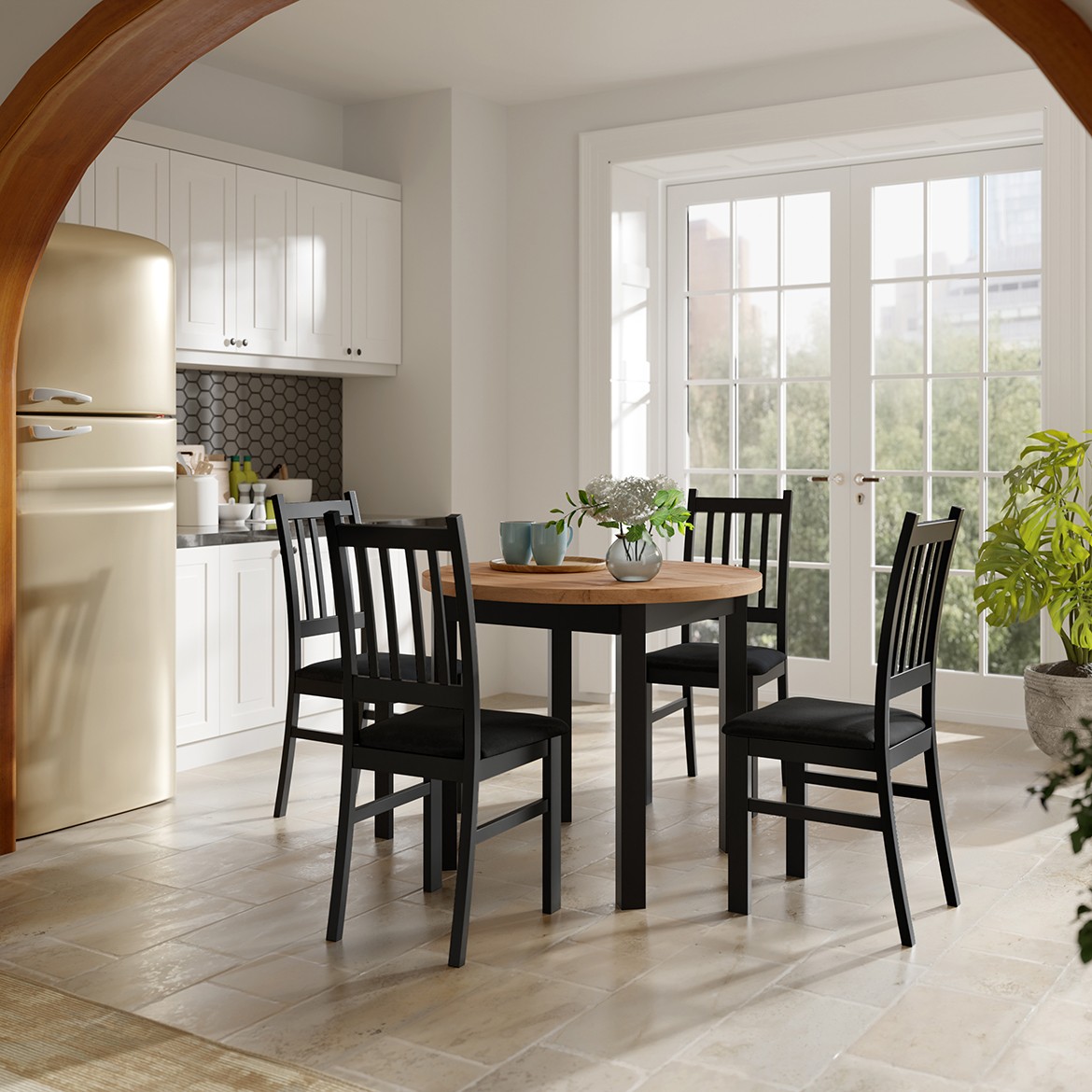 Szukasz praktycznego i stylowego stołu do niewielkiej przestrzeni? Okrągły stół PRIMA 90 cm to idealne rozwiązanie do kuchni, jadalni lub salonu. Połączenie blatu w dekorze dąb artisan z czarnymi nogami tworzy ponadczasowy design, który doskonale wpisuje się w nowoczesne i loftowe wnętrza. To kompaktowy stół do małej kuchni, który łączy funkcjonalność z estetyką.