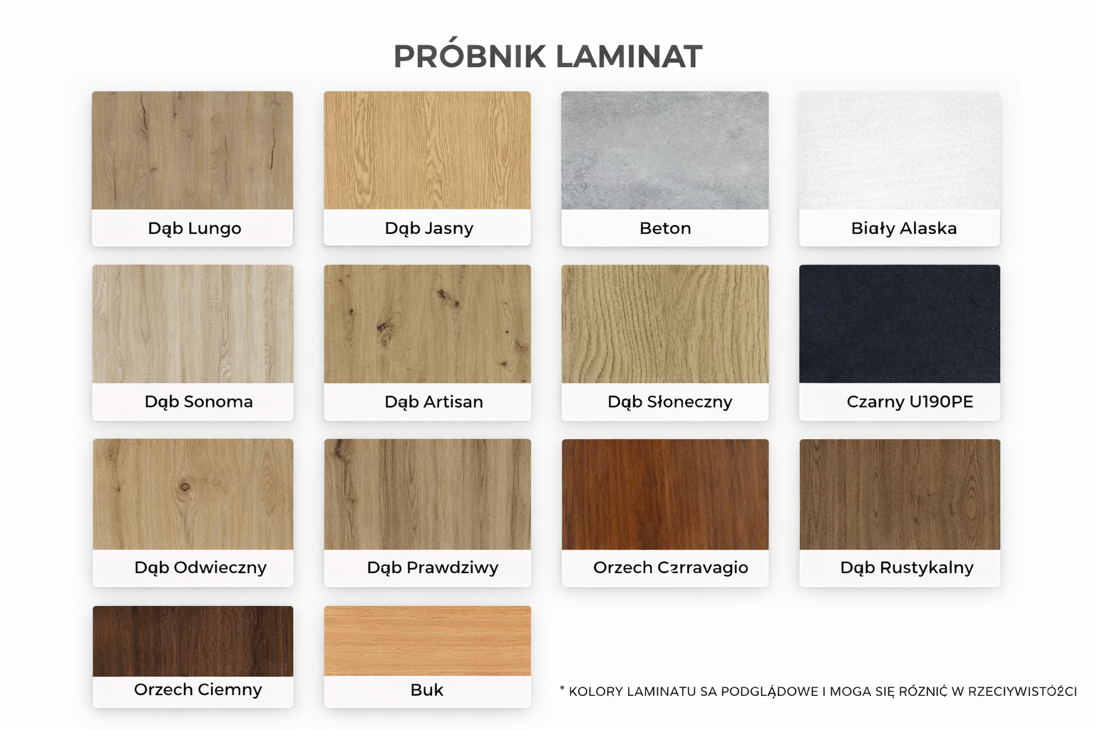 Blat wykonany jest z wysokiej jakości laminatu dostępnego w wielu wariantach kolorystycznych (m.in. dąb, orzech, beton, biały).