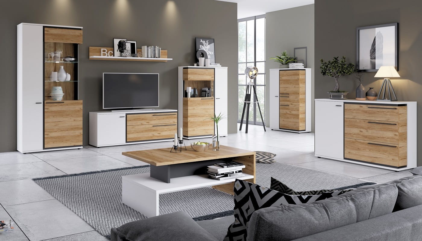 - Twoje przedmioty codziennego użytku, które znajdują się w salonie bardzo chcą schować się przed wzrokiem w pojemnej, nowoczesnej witrynie! Na jej wytrzymałych półkach chusteczki, piloty, czasopisma i przekąski znajdą swoje miejsce i będą w zasięgu dłoni. Wypoczywaj w stylowo zaaranżowanej przestrzeni, która zachwyca uporządkowaniem, nowoczesnością oraz doskonałym dopasowaniem każdego elementu.