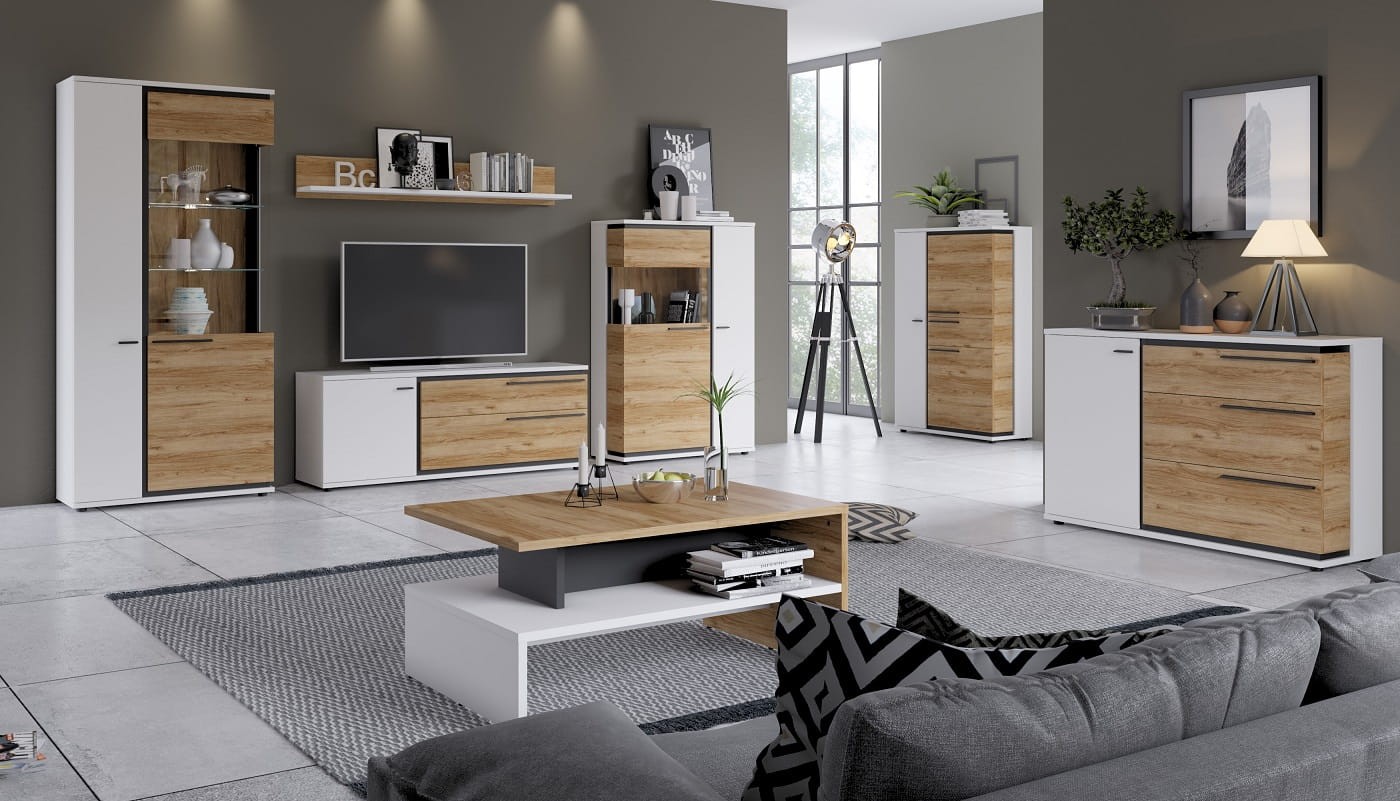 Na wystrój pomieszczenia składają się starannie dopasowane elementy. Salinas jest kolekcją mebli, która w każdym detalu zaskakuje. Odkryj niezwykły efekt wizualny modnych, a zarazem ponadczasowych zestawień kolorystycznych, dzięki którym praktyczne, nowoczesne meble wydobędą piękno każdego pomieszczenia. Seria Salinas to meble, dedykowane do salonu, pokoju gościnnego oraz jadalni. Inspiruj się minimalizmem i stylem industrialnym, urządzając wnętrza z pomysłem. Witryny, komody, szafki i półka Salinas prezentują biel, czerń i efekt drewna w połączeniu z przeszkleniami i czarnymi, poziomymi uchwytami.