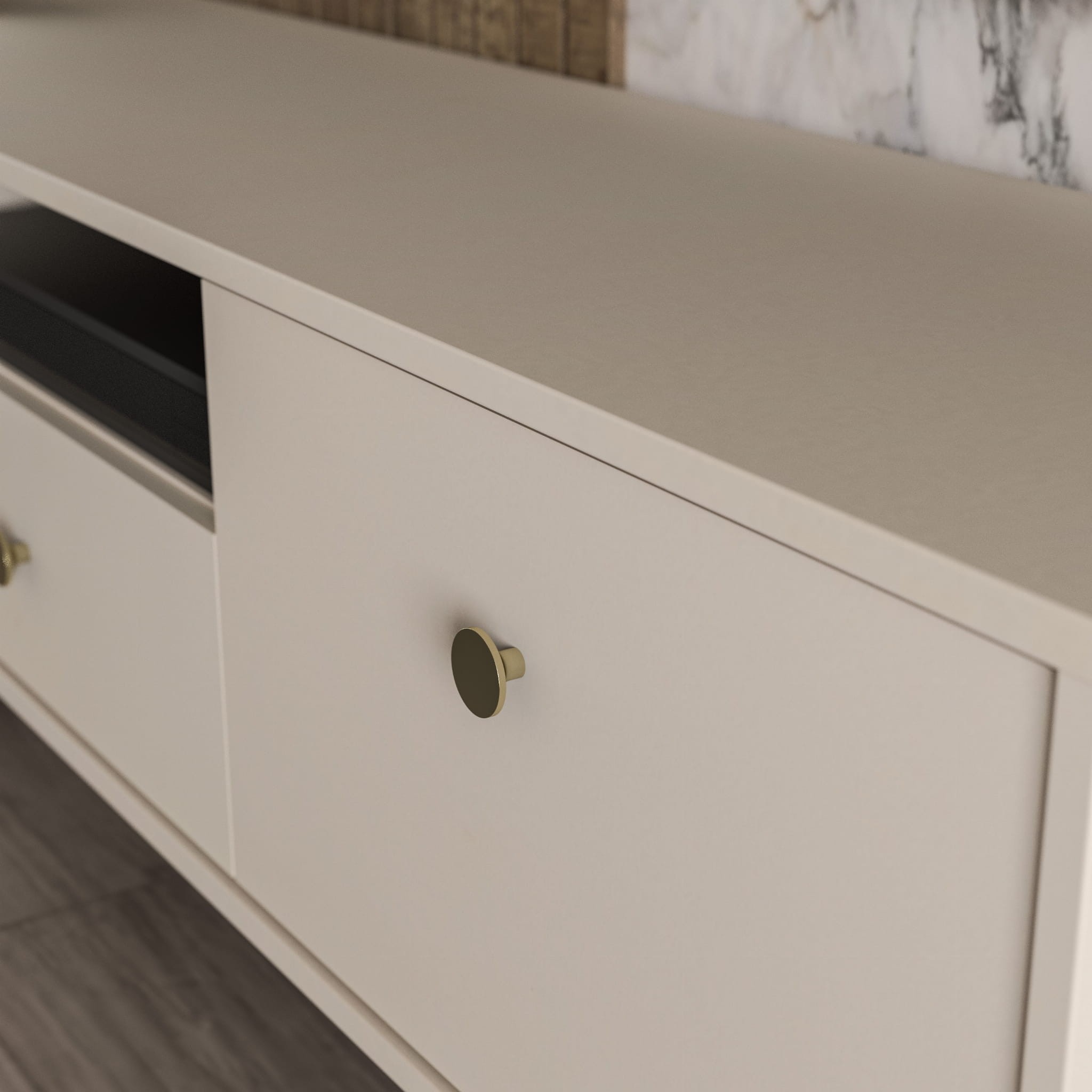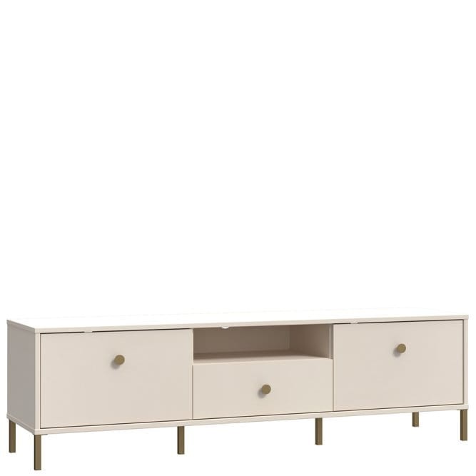- Komoda po telewizor wykonana w modnym, piaskowym kolorze