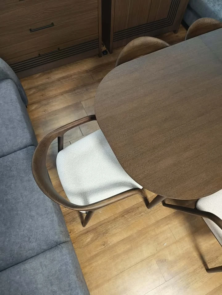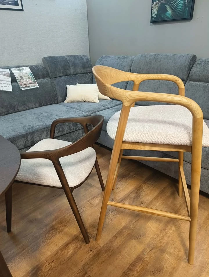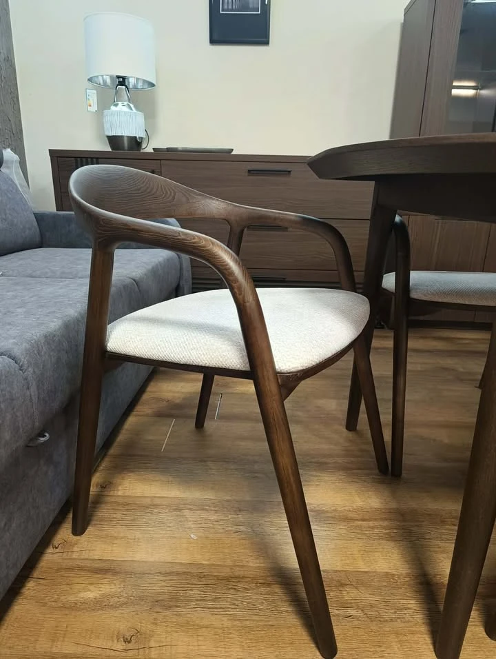Miękkie siedzisko z tapicerką zapewnia wysoki komfort, a możliwość wyboru tkaniny pozwala dopasować krzesło do własnego wnętrza – od spokojnych aranżacji po bardziej wyraziste projekty.