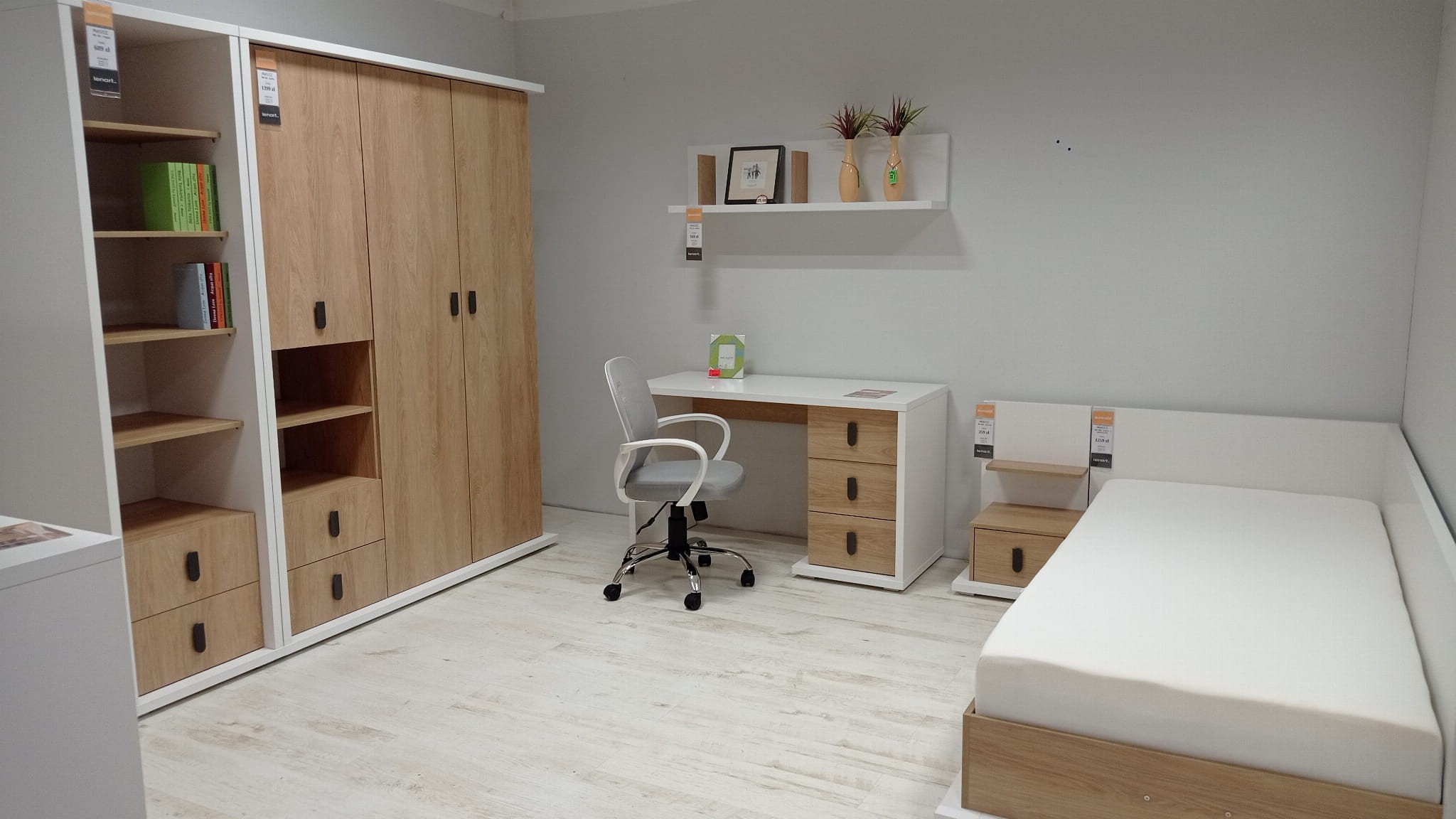 Kolekcja SIMI to meble, których stylistyka spodoba się dzieciom i młodzieży ceniącym modny oraz uniwersalny wzór. Biel i jasny kolor drewna sprawdzą się zawsze i będą dobrze wyglądać. Uwagę zwraca modny, masywny korpus, który jednocześnie wyznacza ramę mebla. Efektowny zabieg stworzyło cofnięcie frontów pod linię korpusu. Mebel wykonano z wytrzymałej płyty laminowanej, wykończonej trwałym obrzeżem ABS.