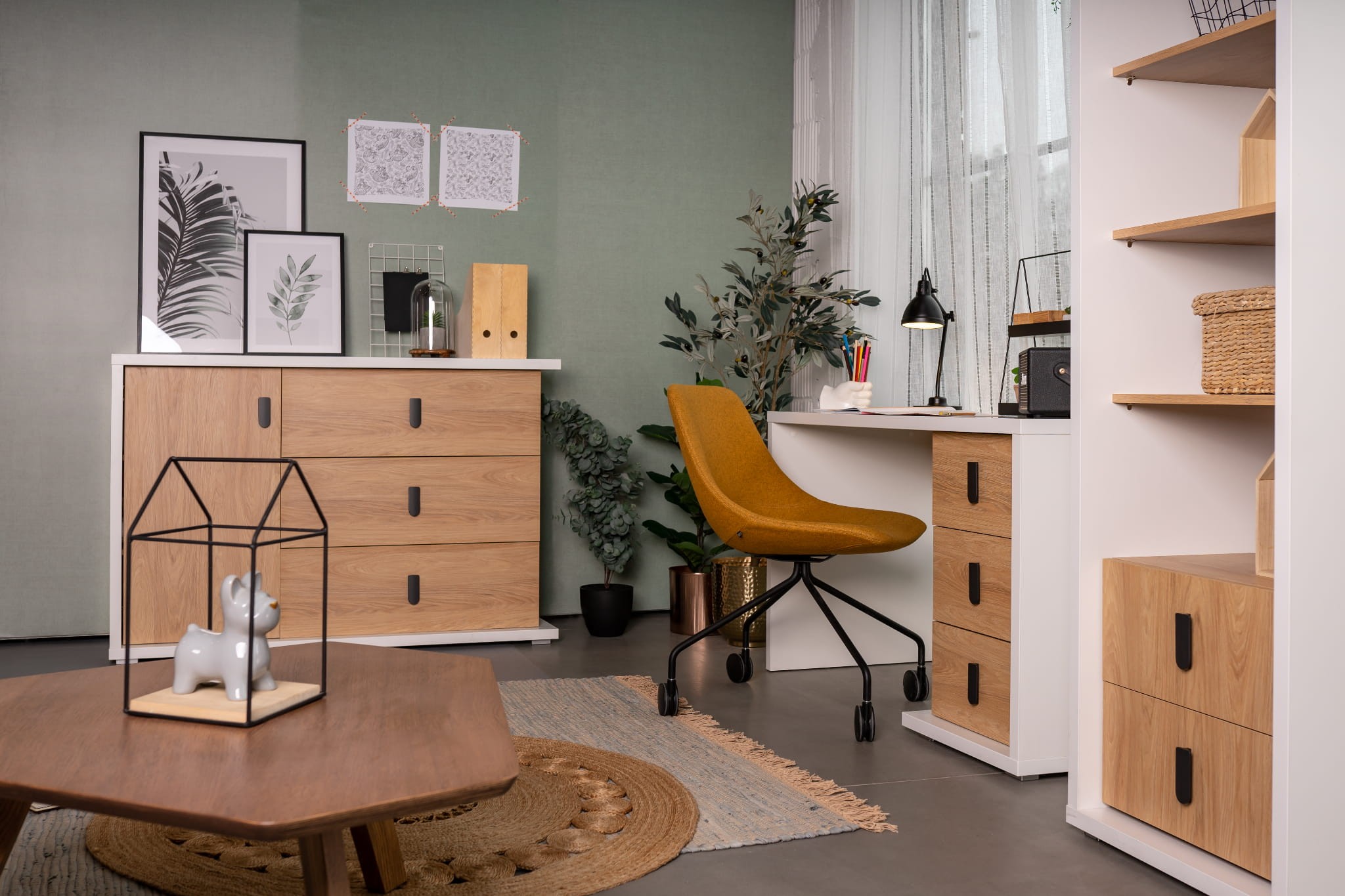SIMI MS-06 biurko z trzema szufladami. Ergonomiczny blat zapewnia dużą ilość miejsca do wygodnej nauki. W pojemnych i łatwo dostępnych szufladach zmieścisz wszystko, co lubisz mieć pod ręką.