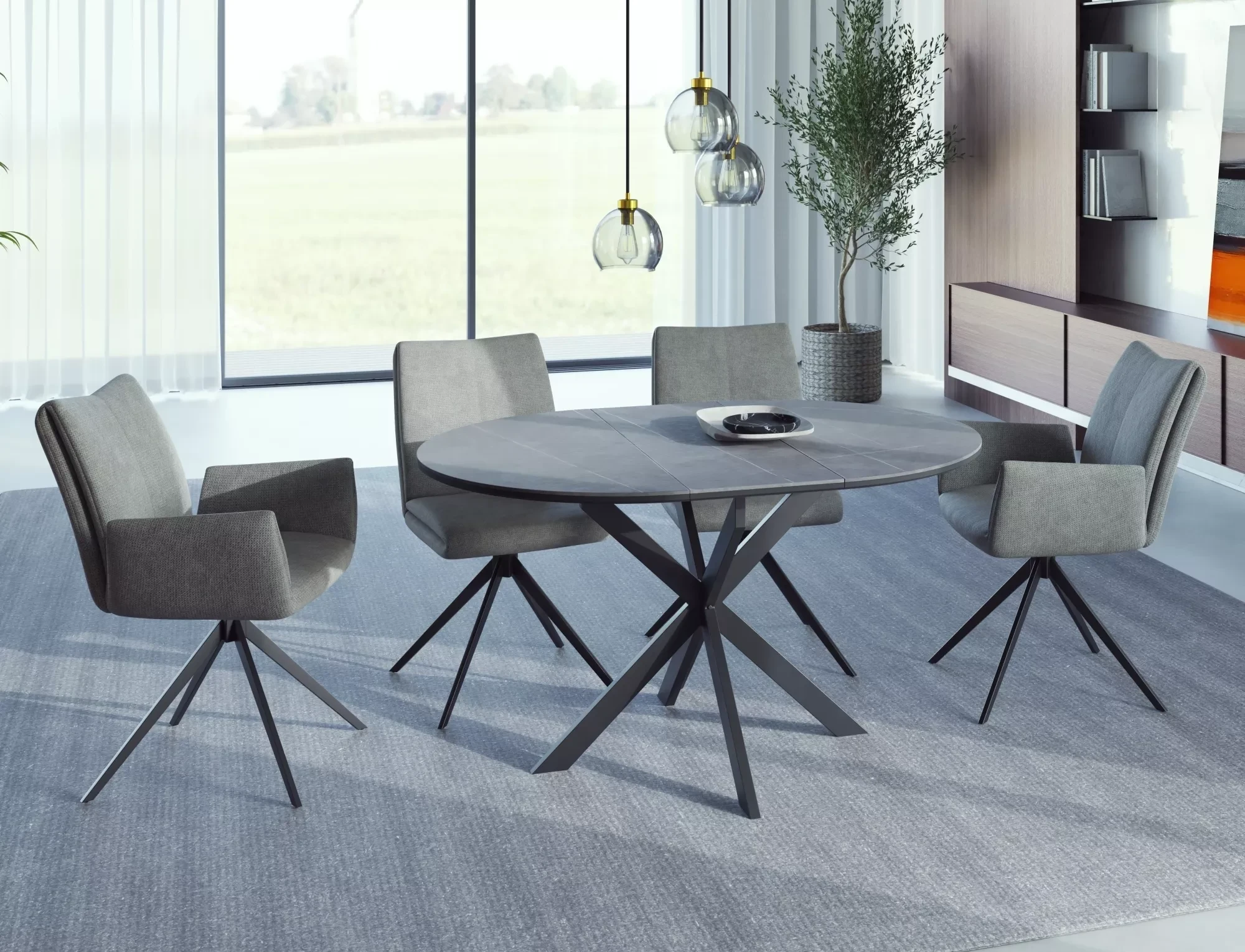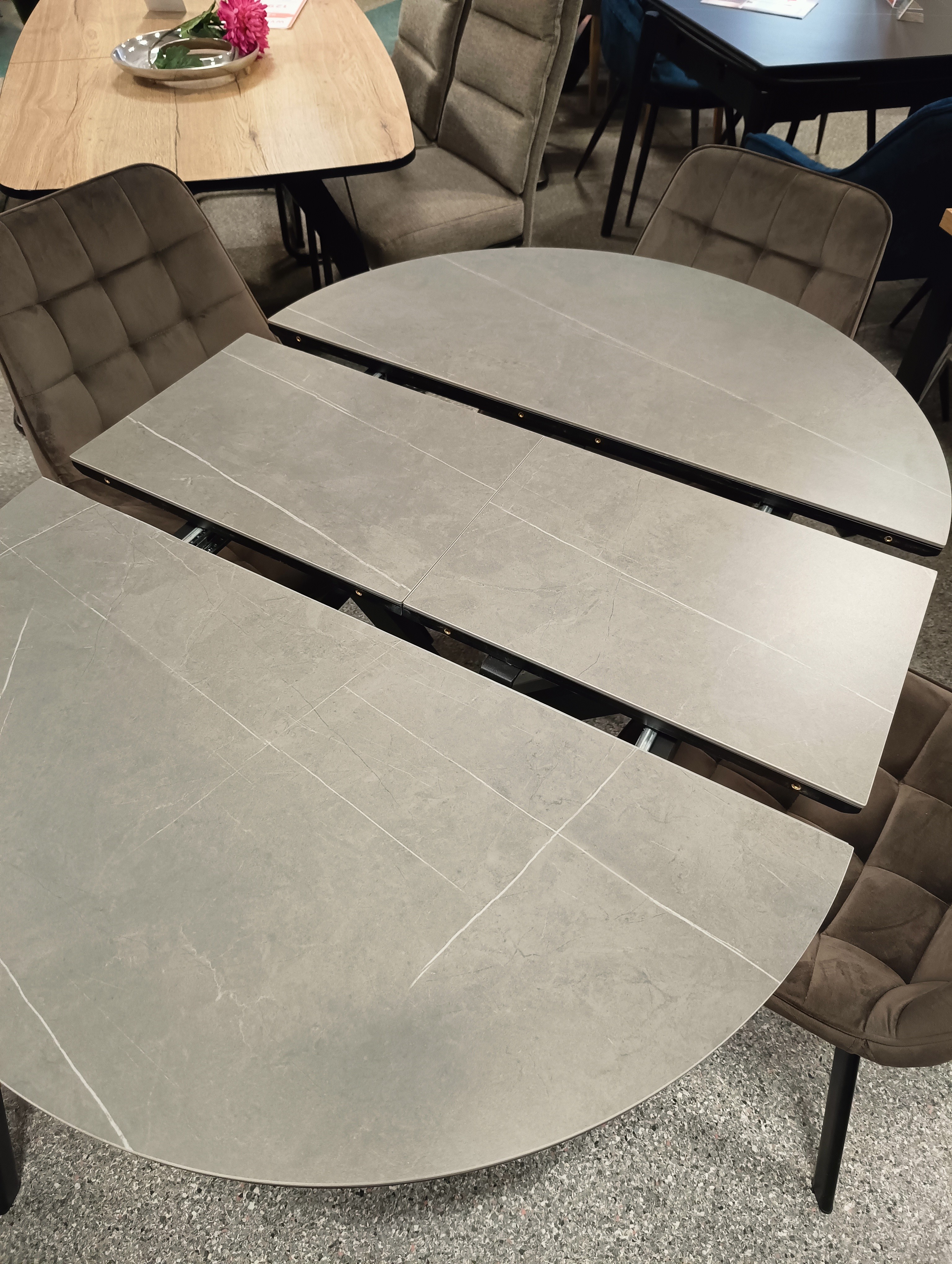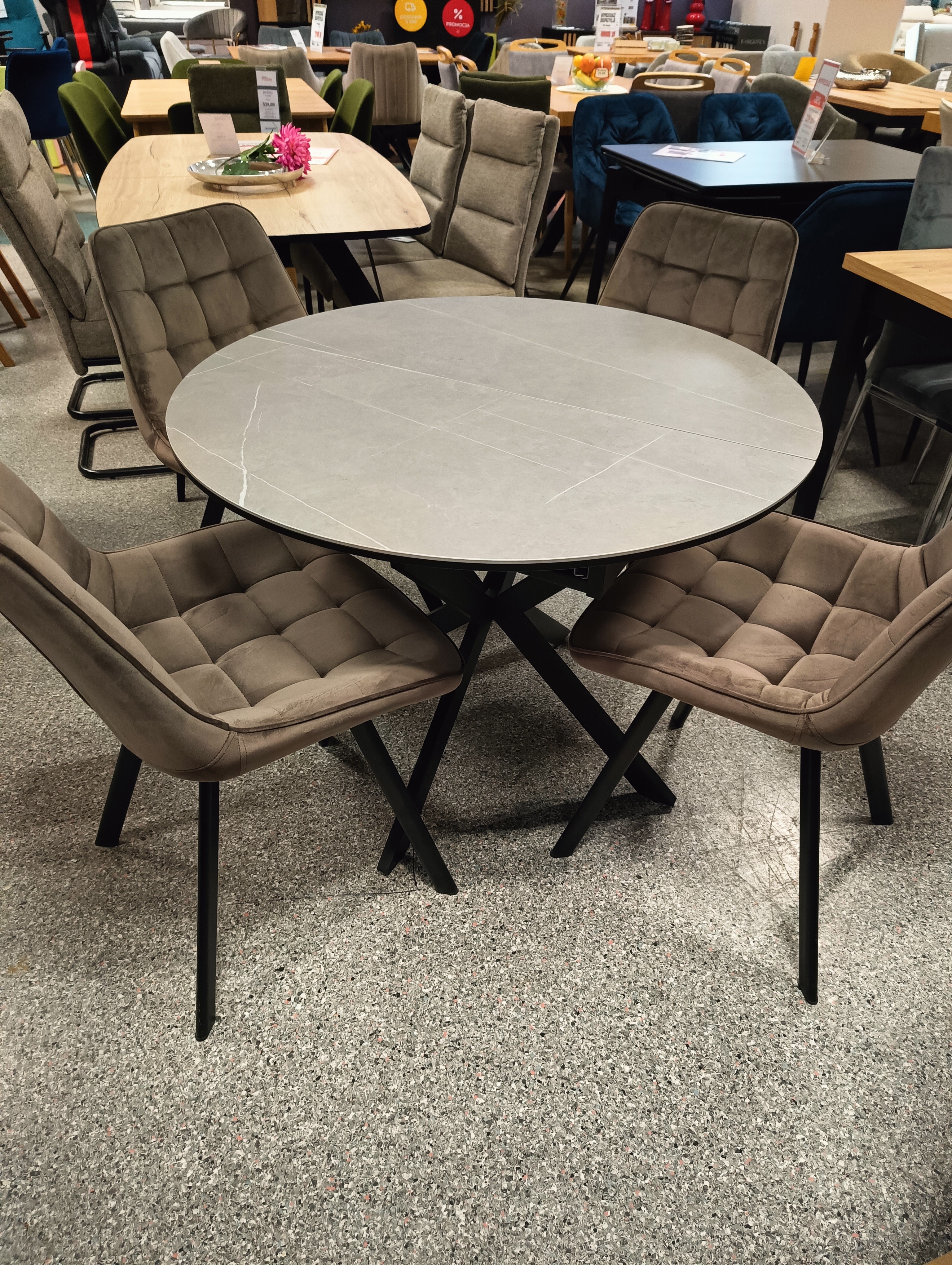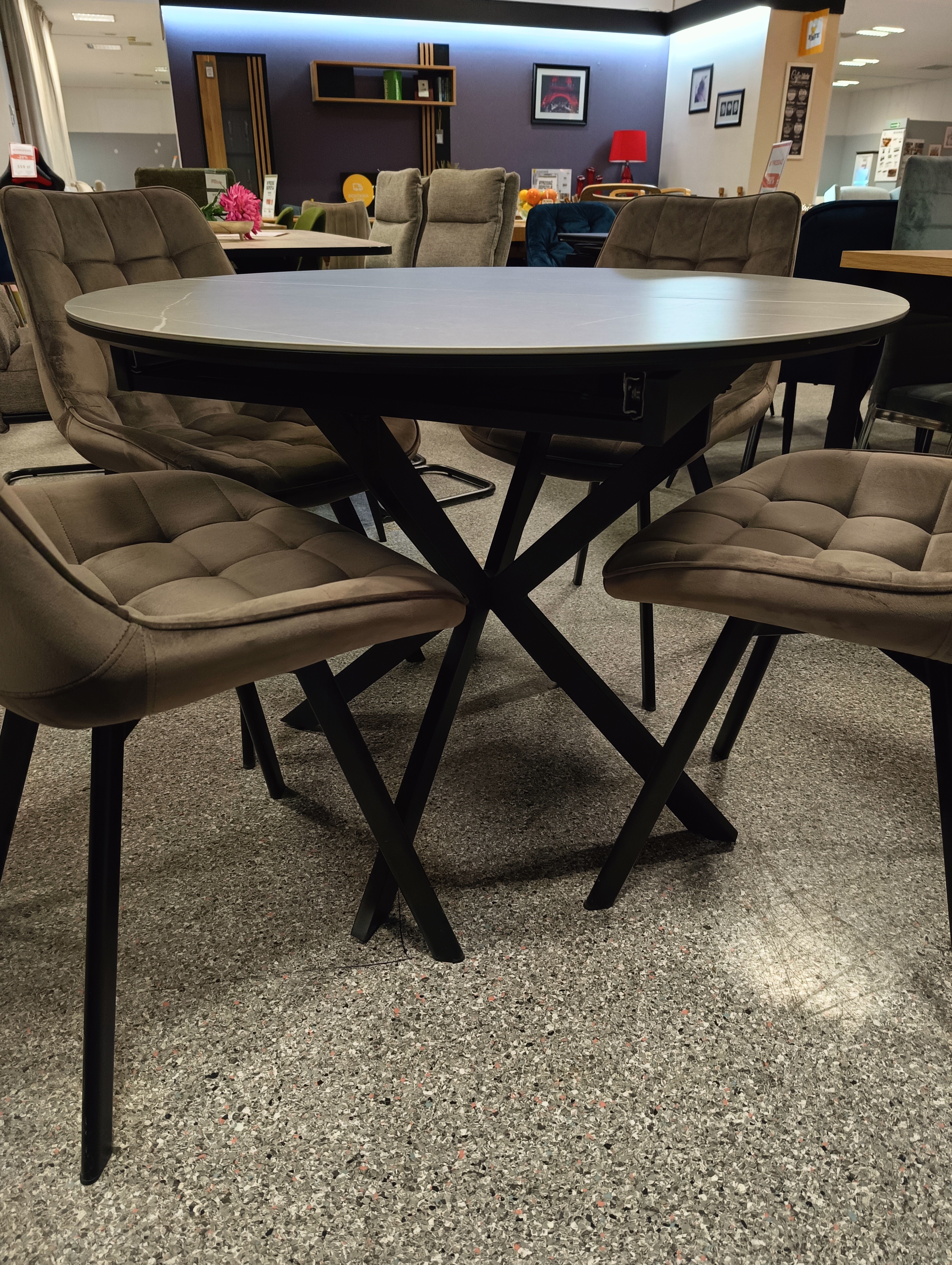 Stół Gaston Ceramic to połączenie elegancji i funkcjonalności. Okrągły blat wykonany z trwałej ceramiki w imitacji marmuru oraz solidna, czarna, matowa podstawa tworzą nowoczesny mebel idealny do jadalni, salonu czy kuchni. Dzięki funkcji rozkładania, stół z łatwością dopasujesz do większej liczby gości.