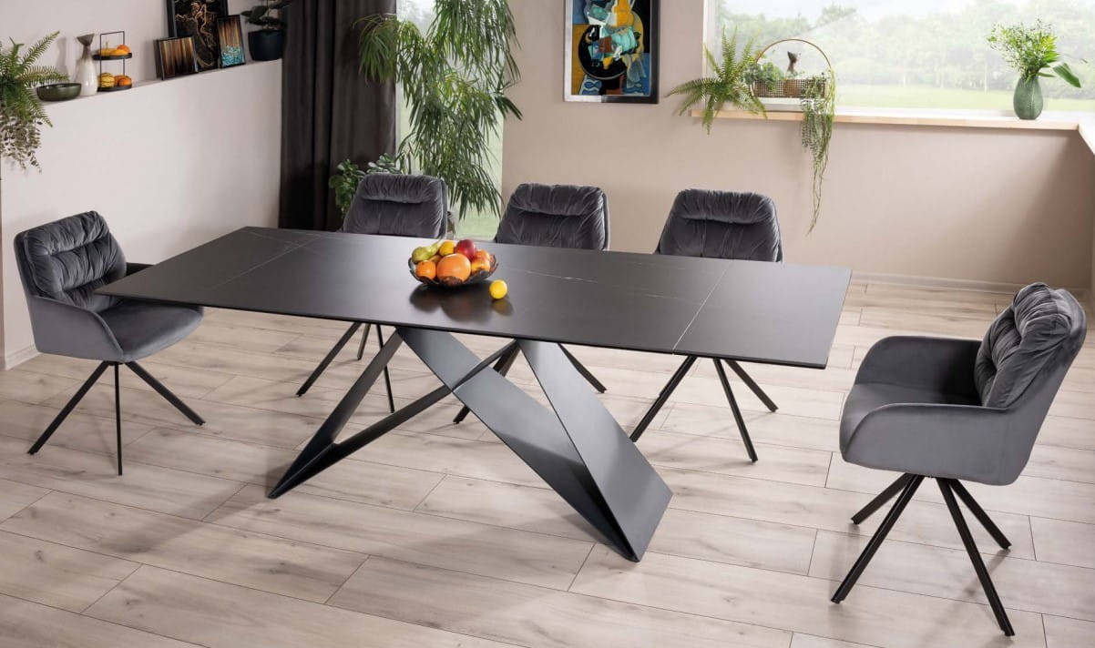 Stół WESTIN CERAMIC (160-240)x90 posiada blat wykonany z włoskiej ceramiki imitujący ciemny marmur Sahara Noir jest bardzo wytrzymały i odporny na uszkodzenia, a przy tym efektowny. Podstawa wykonana z metalu, pomalowana proszkowo na kolor czarny jest bardzo stabilna.