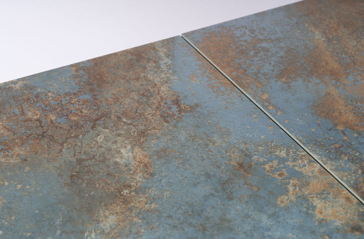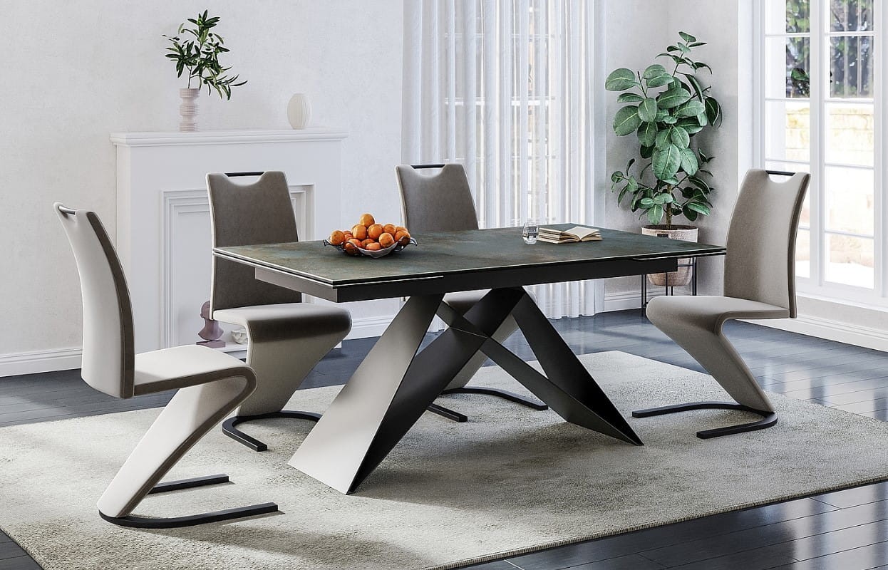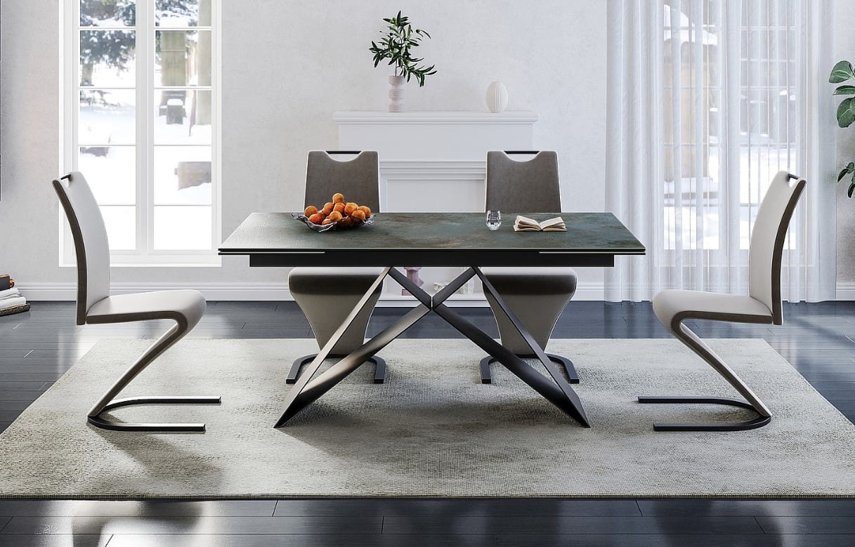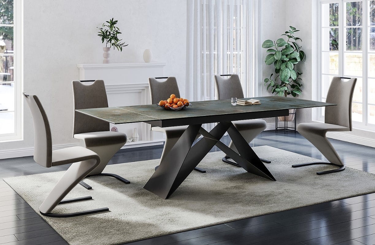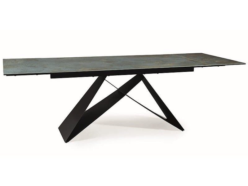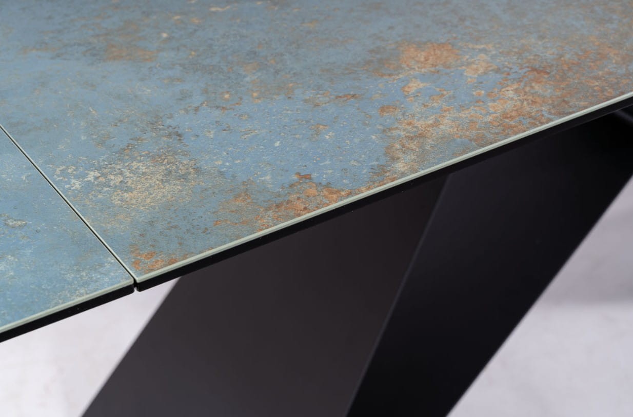 Stół WESTIN CERAMIC (160-240)x90 posiada blat wykonany z włoskiej ceramiki imitujący zielony tlenk ossido verde jest bardzo wytrzymały i odporny na uszkodzenia, a przy tym efektowny. Podstawa wykonana z metalu, pomalowana proszkowo na kolor czarny jest bardzo stabilna.