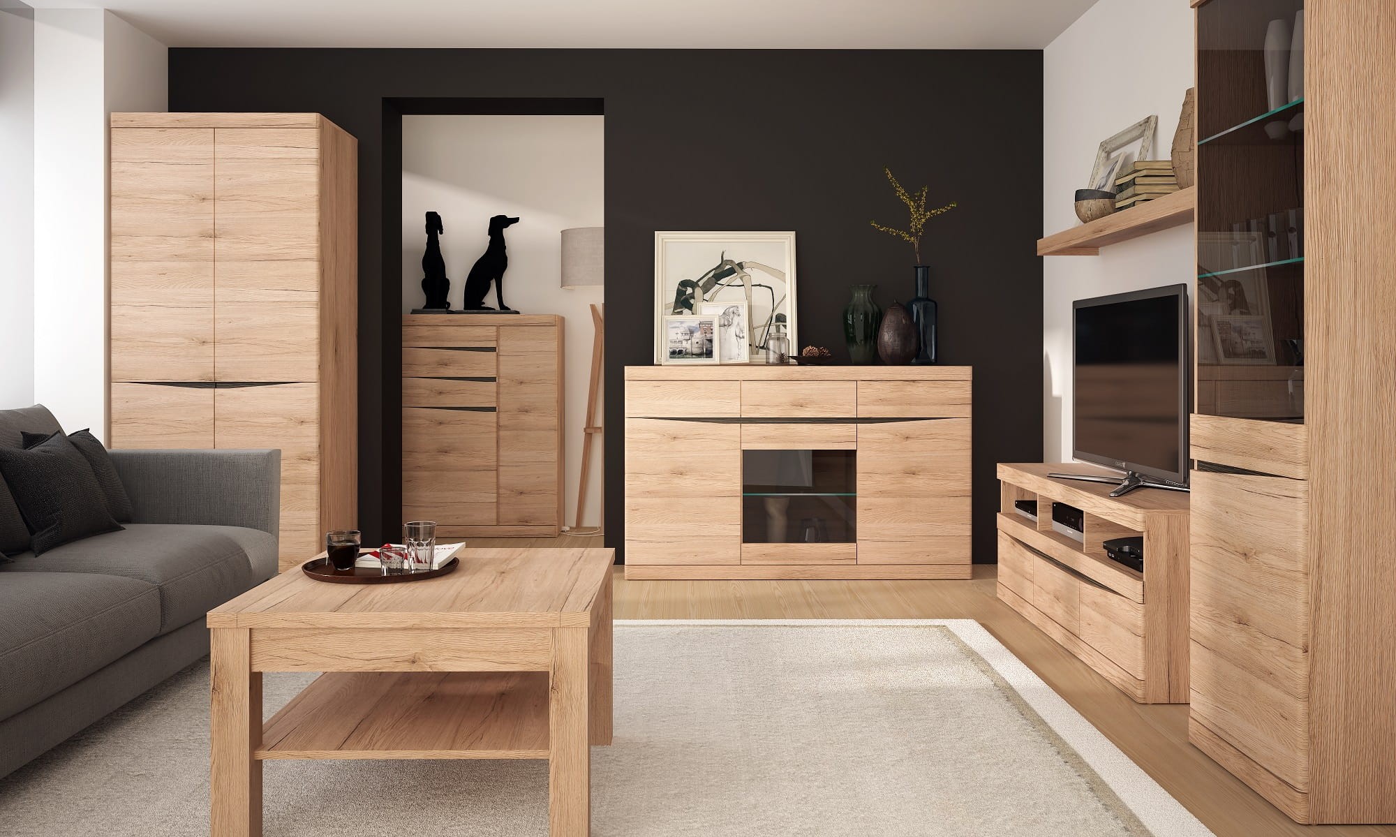 Wyrazisty rysunek drewnianego dekoru podkreślony został kontrastującymi podfrezowaniami, które pełnią rolę uchwytów. Wzrok przyciągają szerokie poziome listwy, sąsiadujące z solidnymi frontami mdf. Aż trudno uwierzyć, że nawet przy tak mocnych akcentach, bryły z kolekcji Summer sprawiają wrażenie lekkich i kompaktowych. Z powodzeniem zaaranżujesz nimi nawet niewielką przestrzeń.