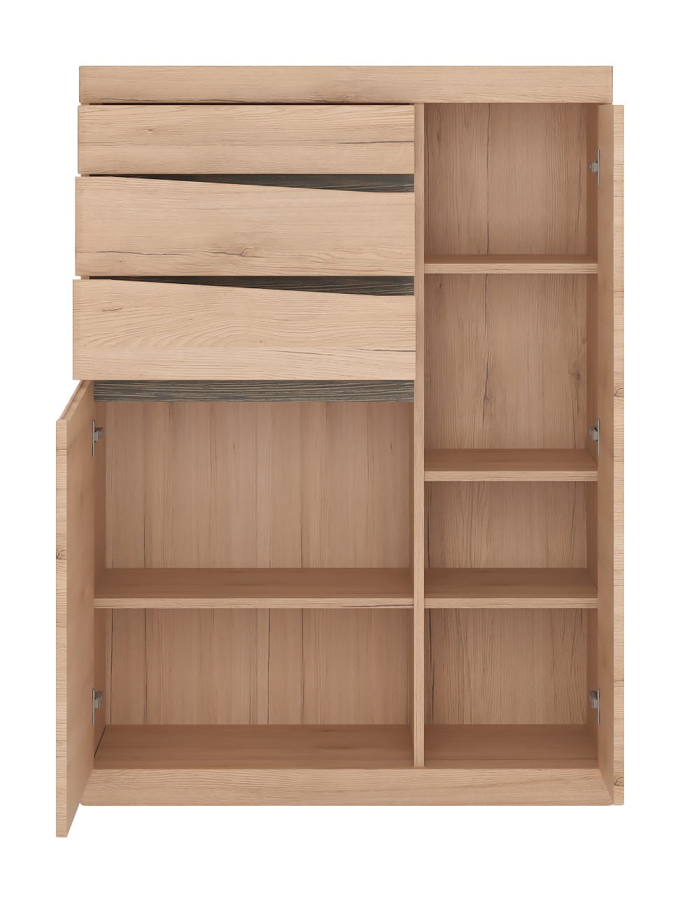 - Wygodną przestrzeń do zagospodarowania znajdziesz za pełnymi frontami, gdzie ukryto sześć pojemnych półek. Wiele przedmiotów pomieszczą także trzy szuflady.