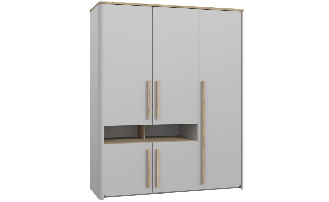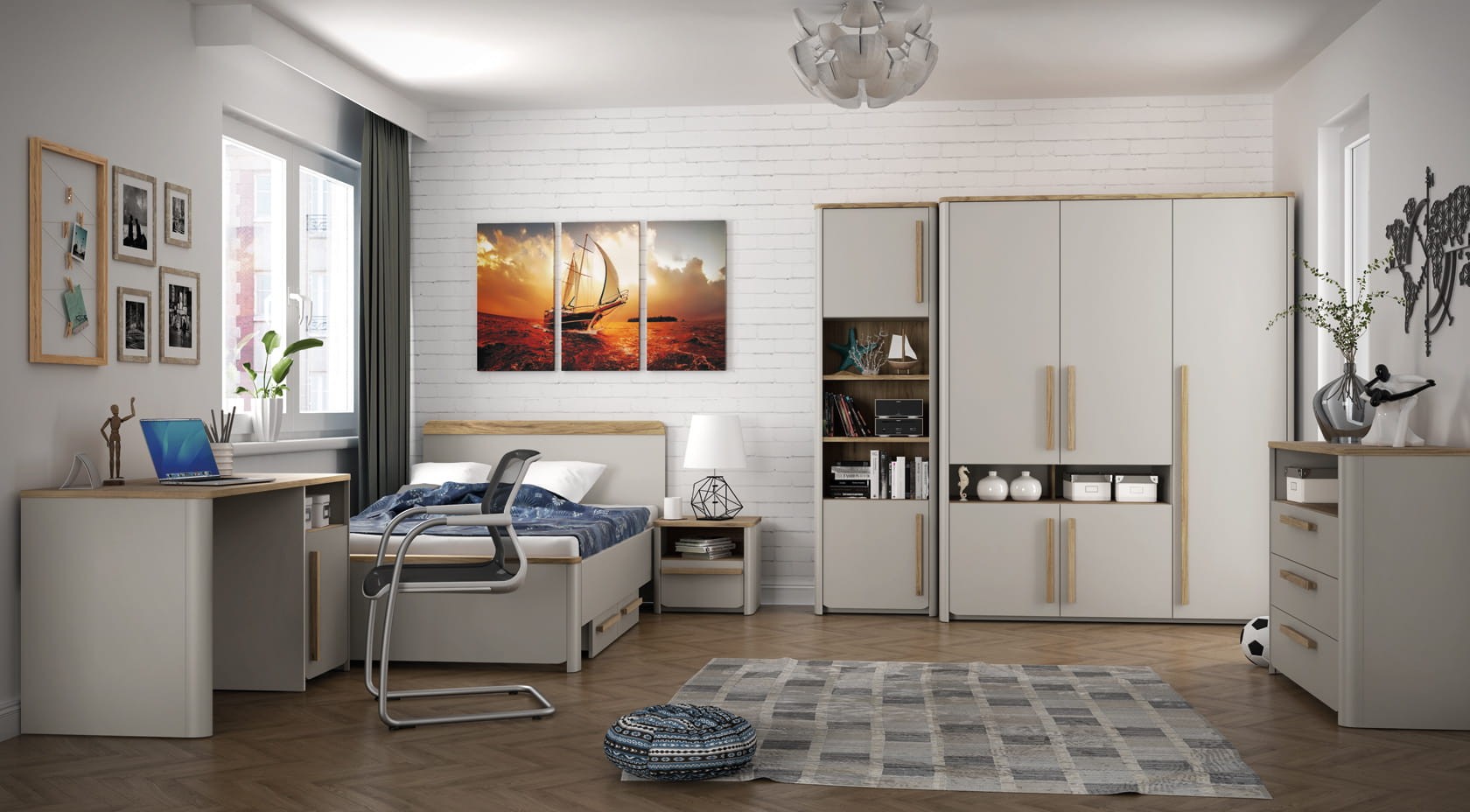 Kolekcja SURFINIO to połączenie chłodnej szarości z dębowym dekorem, który przełamuje surowy klimat mebla. Uniwersalna szarość pozwala na odważne połączenia z innymi kolorami i daje wiele aranżacyjnych możliwości. Pojemna szafa i komoda z szufladami pomogą utrzymać porządek, a wygodne biurko i regał na książki ułatwią naukę. Dzięki zastosowaniu zaokrąglonych krawędzi mebli zwiększa się bezpieczeństwo użytkowania. Duże pionowe uchwyty w dębowym odcieniu są nie tylko praktyczne ale również stanowią ozdobę mebla.