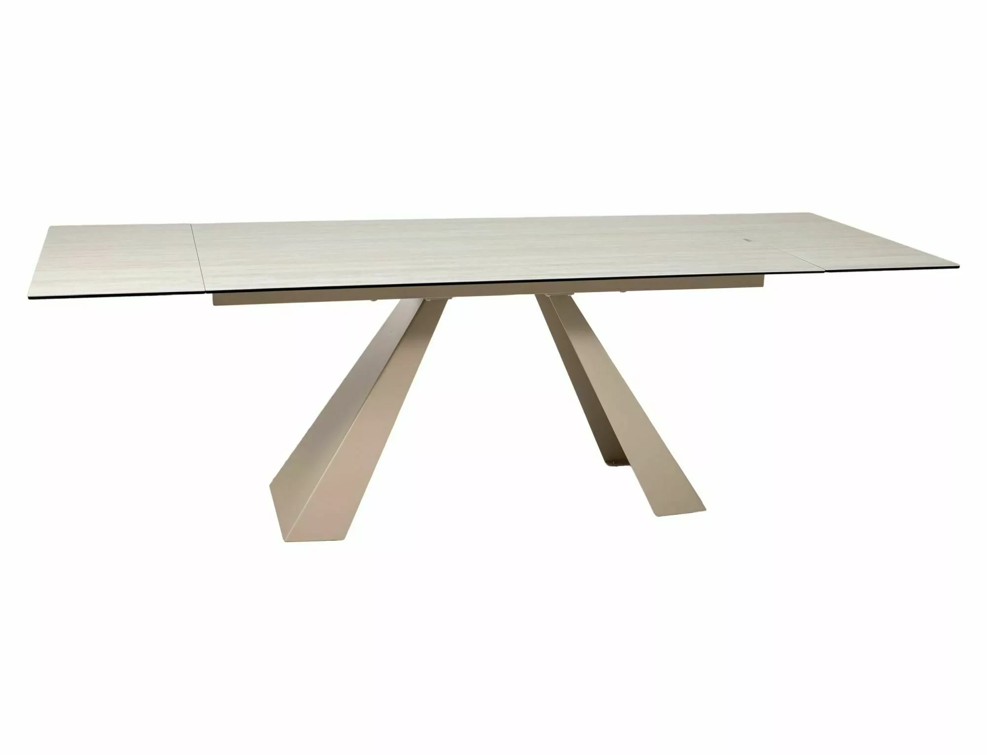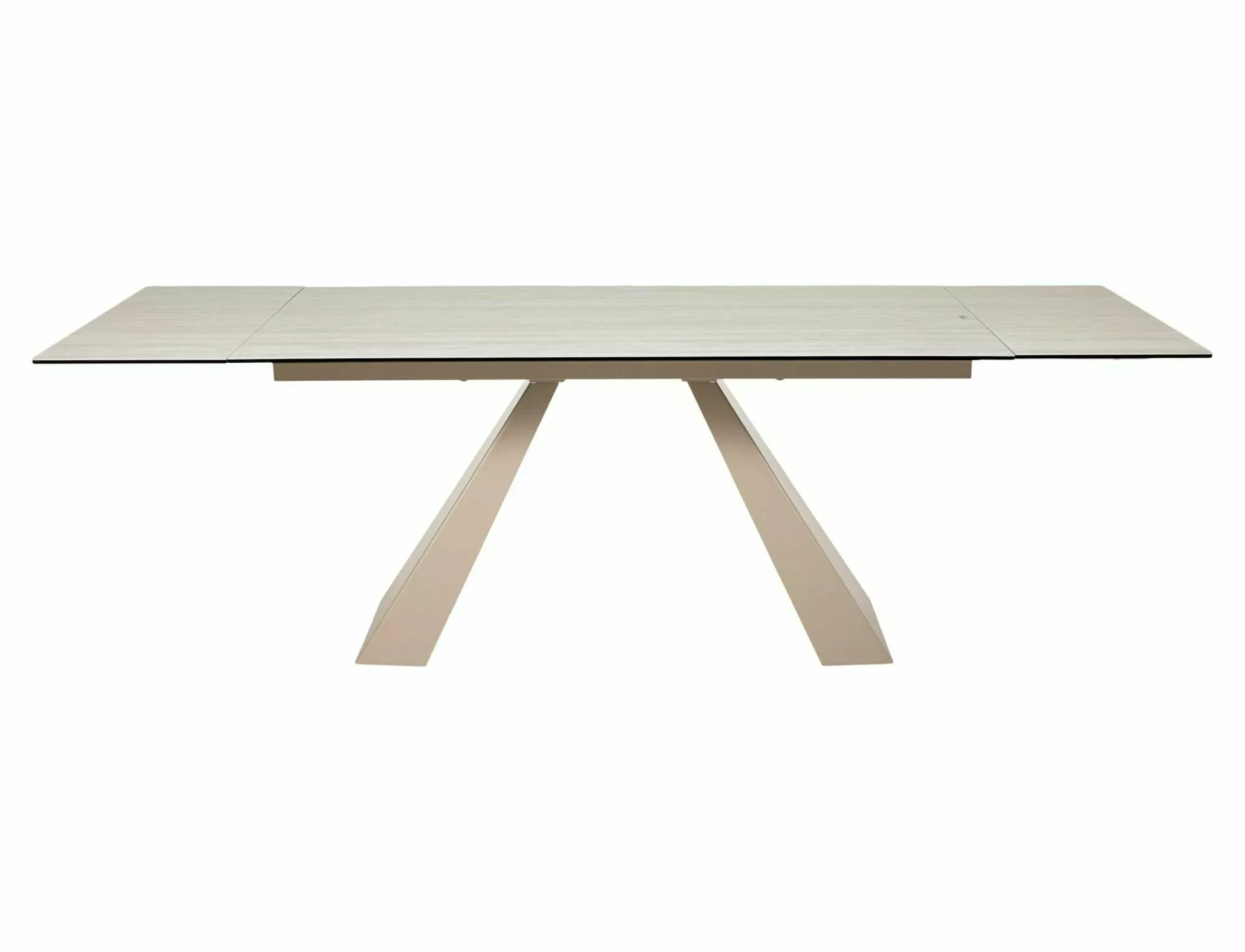 Stół rozkładany, blat: szkło hartowane + ceramika Travertine, stelaż: metal, kolor: beż mat / kaszmir.