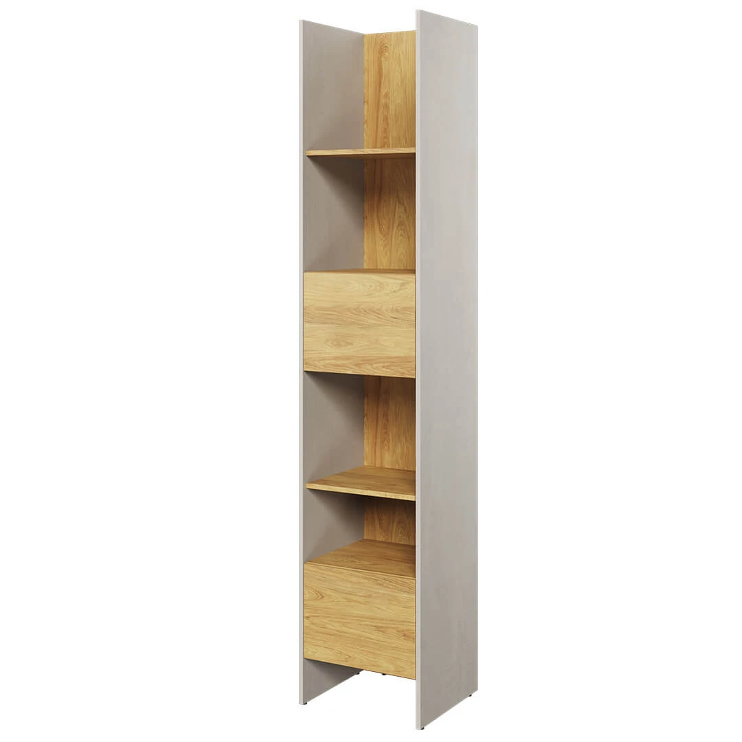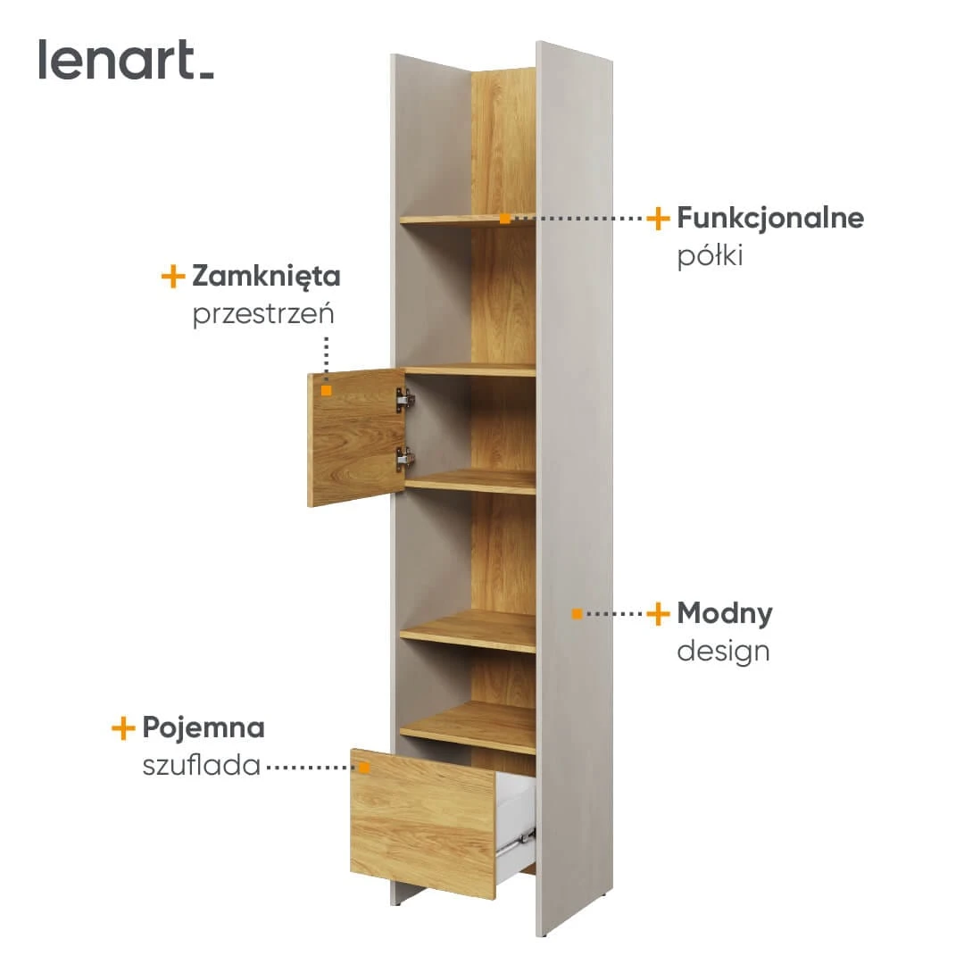 Regał doskonale prezentuje się w zestawieniu z innymi meblami z tej samej serii – szczególnie ustawiony obok szafy tworzy funkcjonalną i estetyczną przestrzeń do nauki i przechowywania.