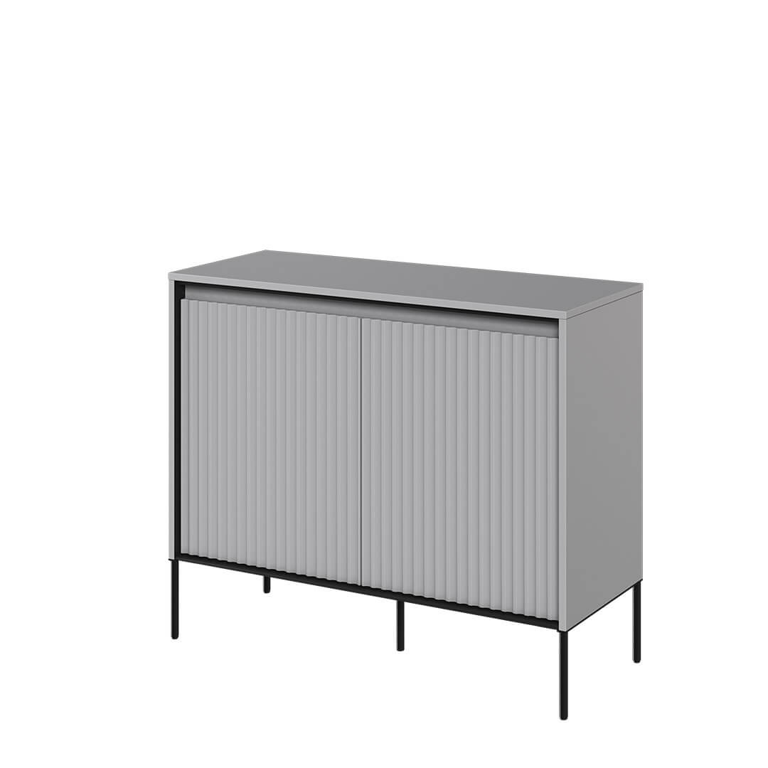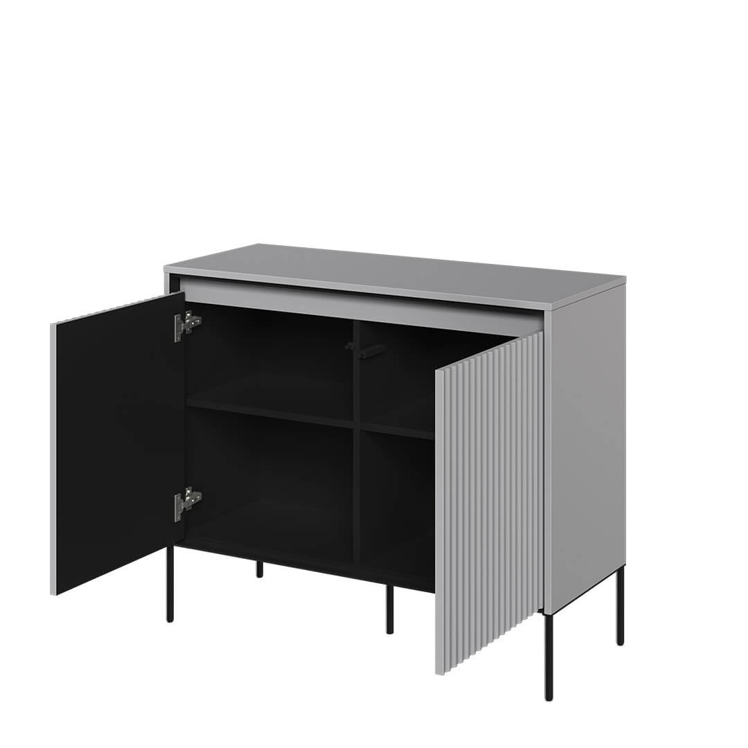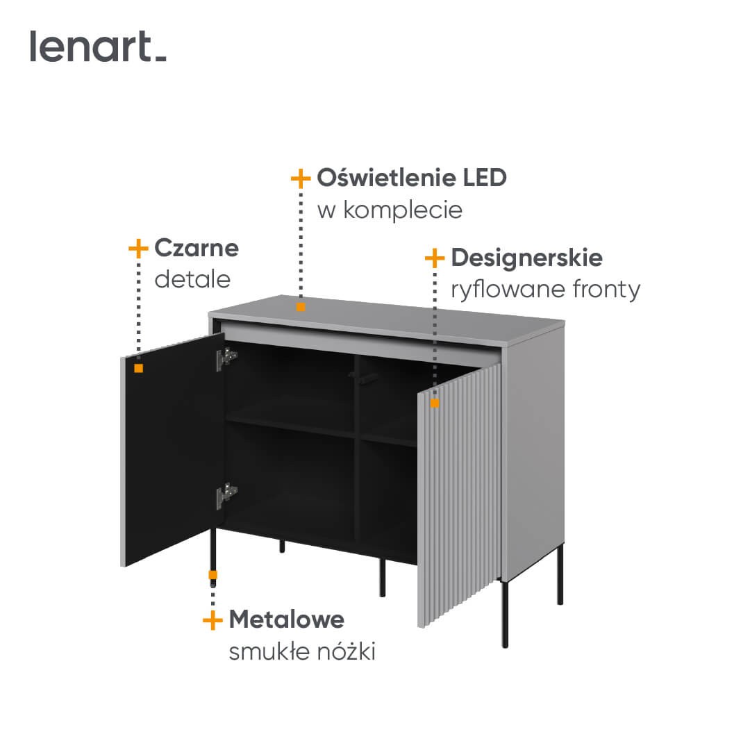 Wyjątkowym elementem tej komody są ryflowane fronty, które dodają jej niepowtarzalnego uroku i charakteru. Ryfle nadają meblowi elegancji i wyjątkowości, wyróżniając go spośród innych mebli na rynku. To idealny wybór dla tych, którzy cenią sobie oryginalny design i chcą dodać nieco tekstury i stylu do swojej przestrzeni. Mała komoda biała wspiera się kontrastowych czarnych, metalowych nóżkach, a całość dopełnia subtelne podświetlenie frontów w postaci paska ledowego.