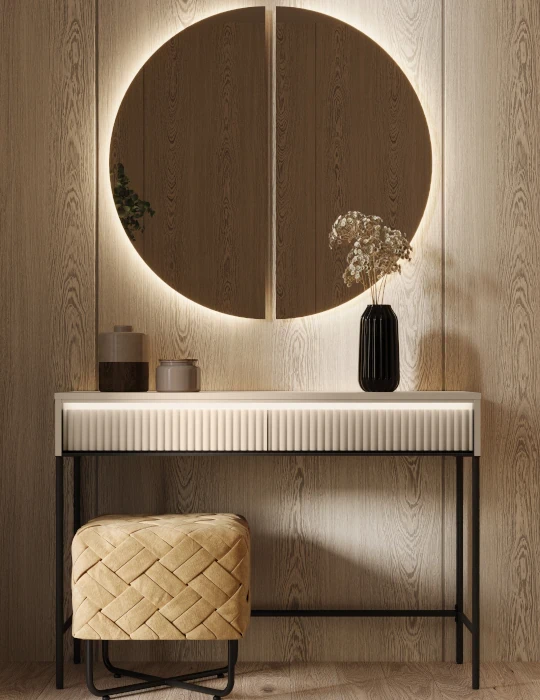 Lustro w kształcie dwóch symetrycznych półokręgów z podświetleniem LED, to stylowy i funkcjonalny dodatek do wnętrza. Jego oryginalny design przyciąga wzrok i dodaje pomieszczeniu nowoczesnego charakteru. Lustro doskonale sprawdzi się w sypialni i garderobie, optycznie powiększając przestrzeń i rozświetlając ją.