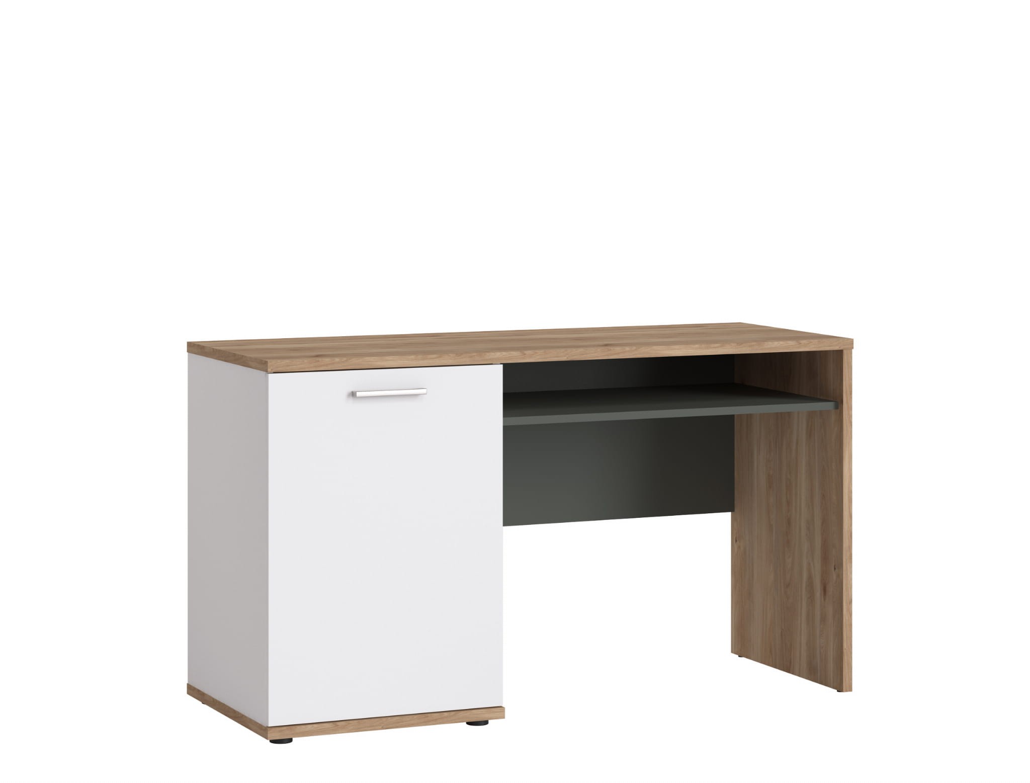 Biurko z jednymi drzwiami oraz półką, umieszczoną pod blatem powstało z płyty wiórowej laminowanej, a jego kolorystyka, złożona z naturalnego odcienia drewna (Dąb Honey Castello) w zestawieniu z Bielą Alpejską i Szarym Grafitem wyznaczą koncepcję wystroju pomieszczenia. Wyrazisty akcent stylistyczny świetnie skomponuje się z pozostałymi elementami kolekcji Twenty.