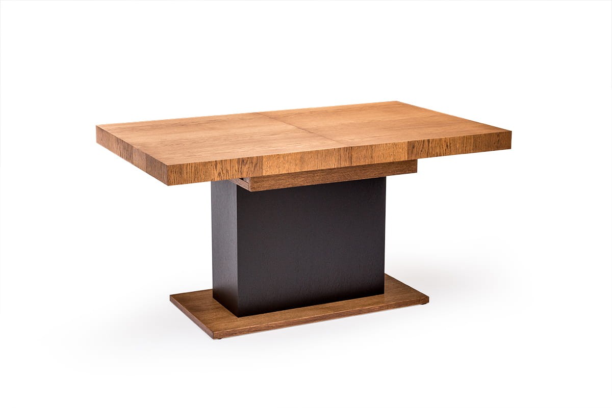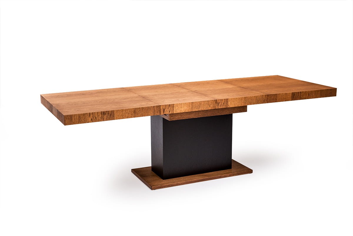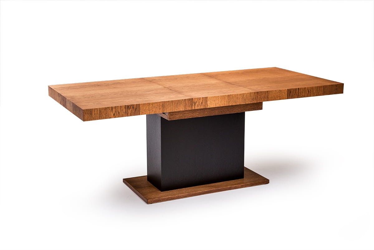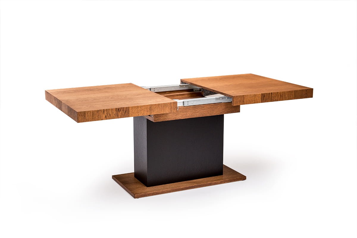 Stół dębowy VALENTINO to nowoczesny stół na kolumnie. W skrzyni stołu umieszczono dwie wkładki po 50 cm które umożliwiają jego rozłożenie. Metalowe prowadnice synchroniczne (wystarczy ciągnąć z jednej strony aby rozsunąć blaty) zapewniają łatwe i szybkie rozkładanie.