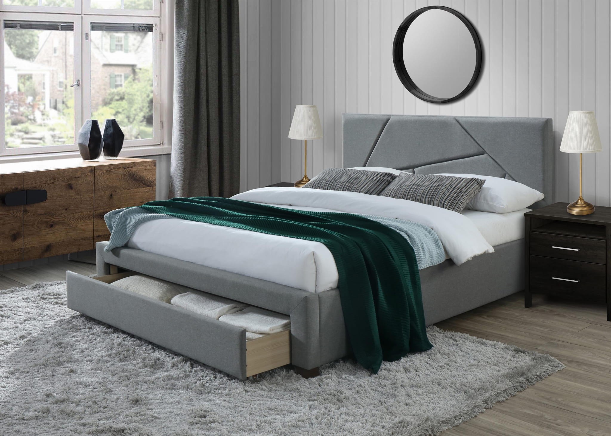 wymiary: 165/214/102 cm, łóżko z szufladą, materiał: tkanina / drewno lite, kolor: tkanina - popielaty, drewno - orzech, * łóżko bez materaca, w opcji materac POLARIS 160