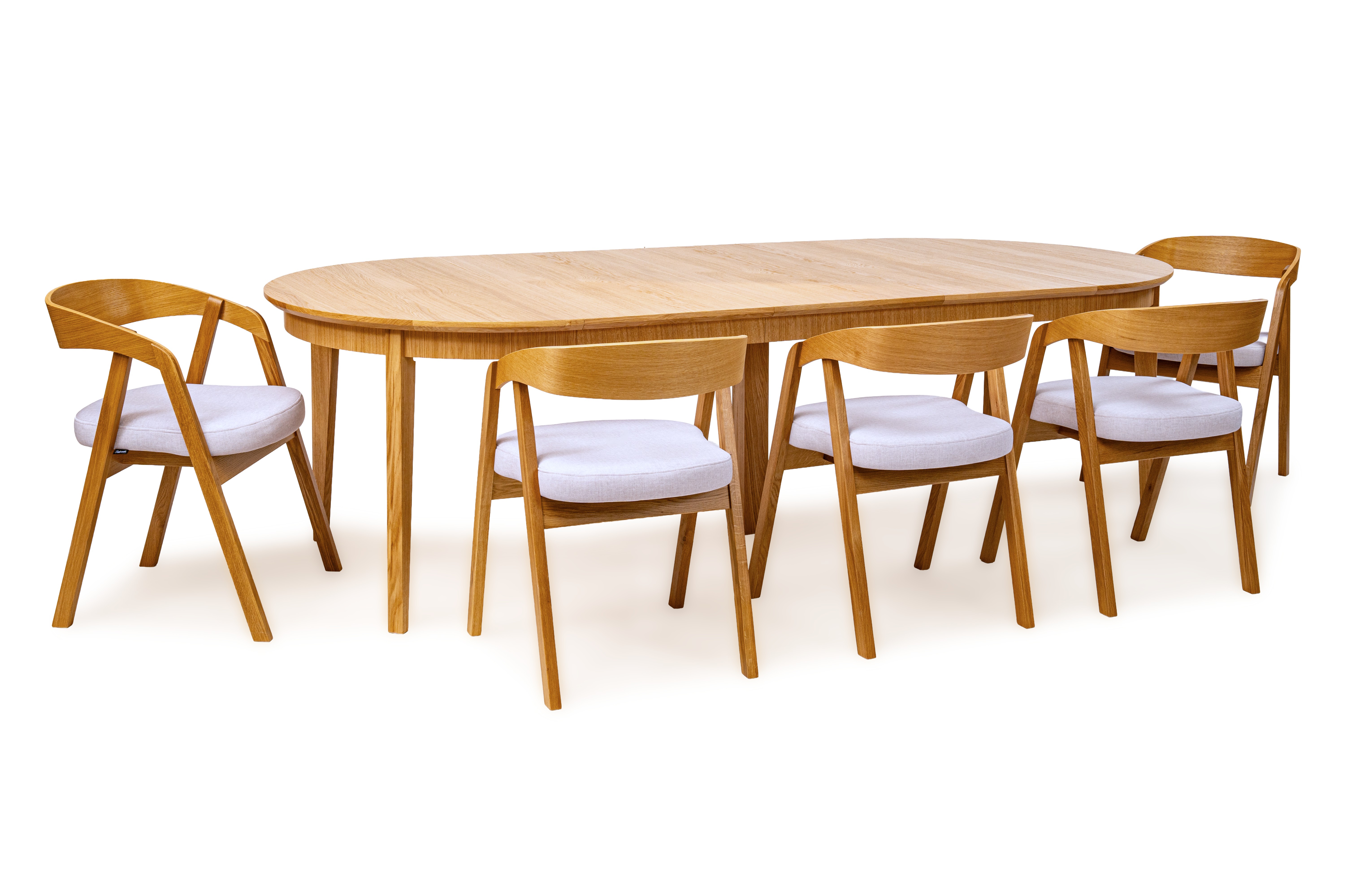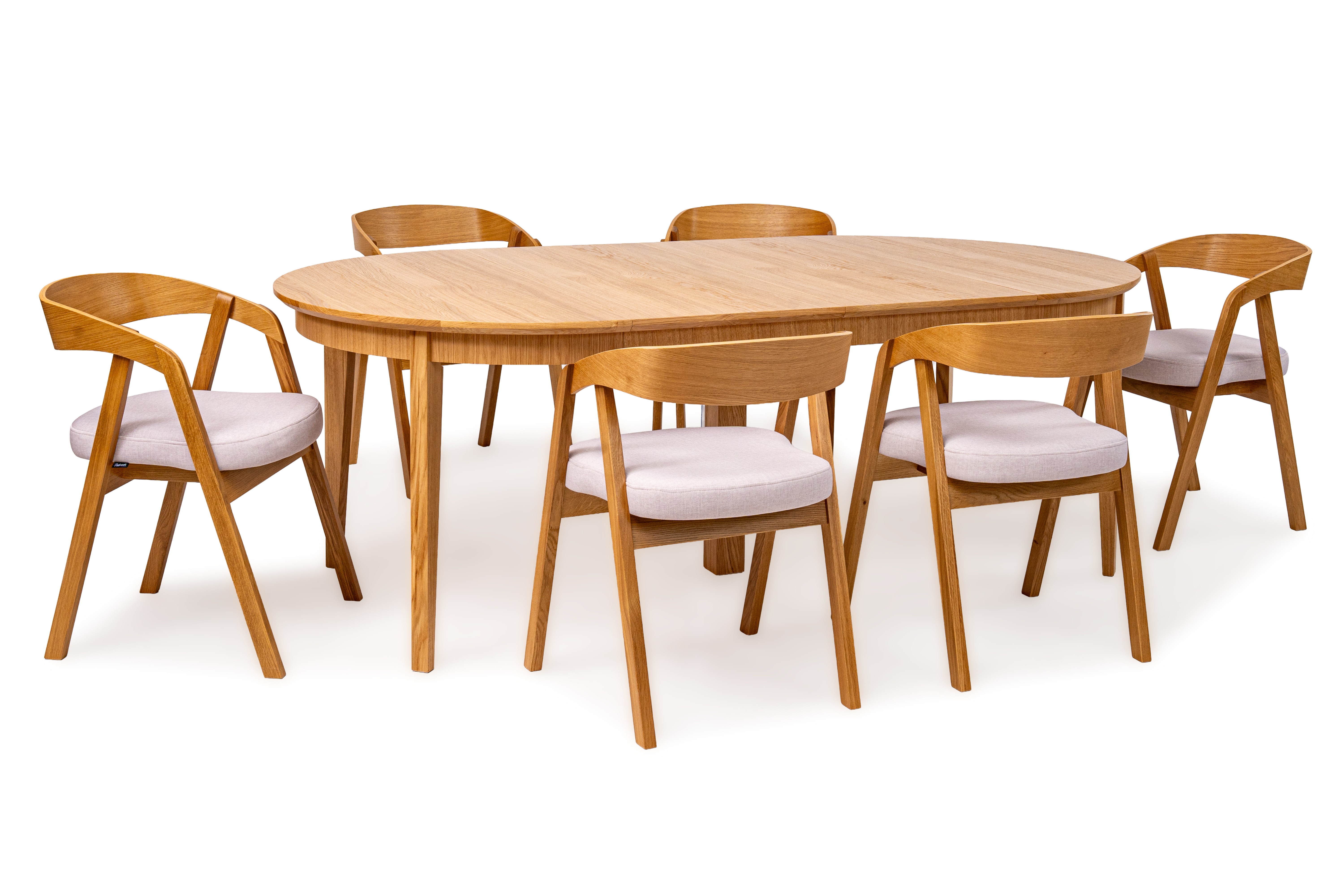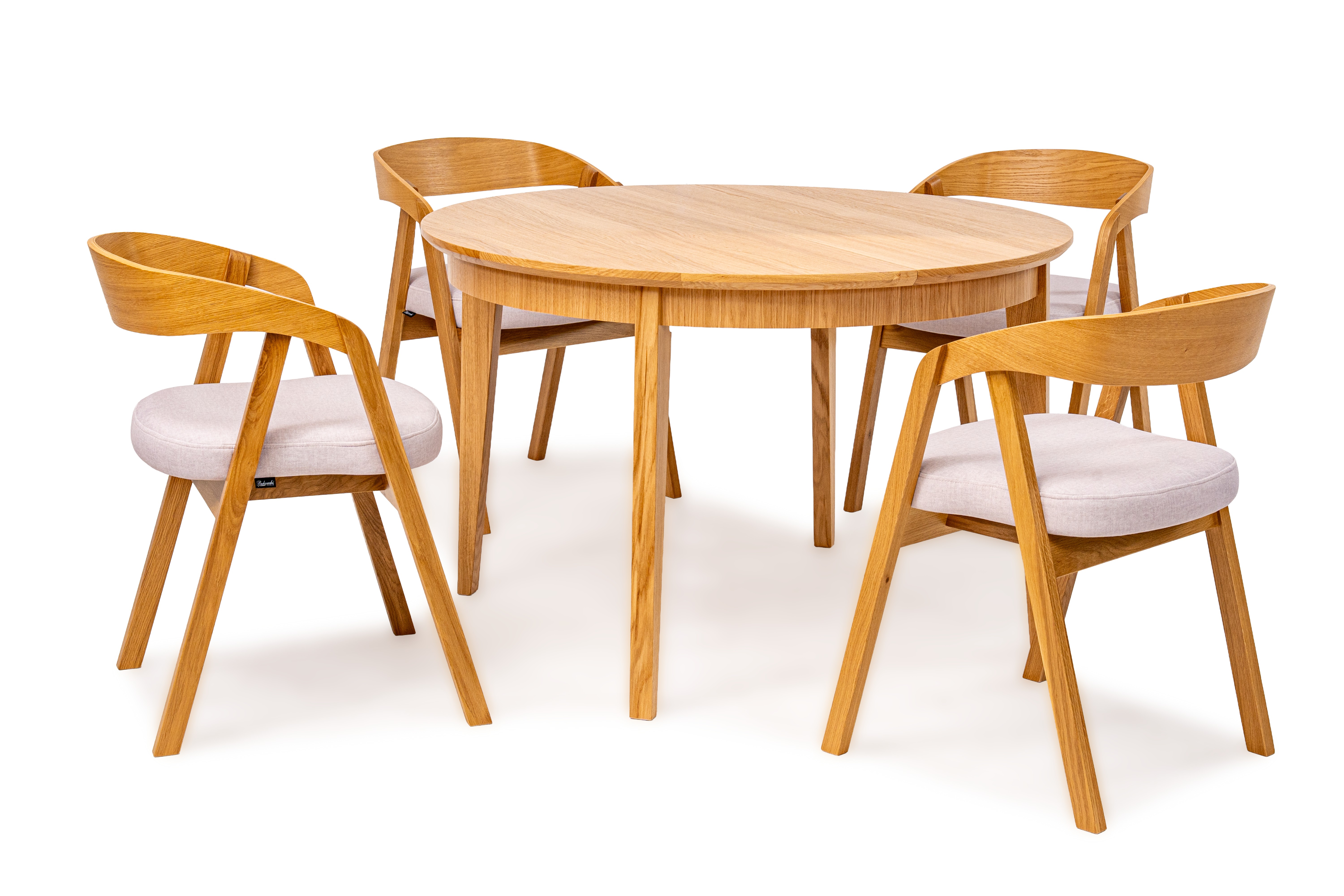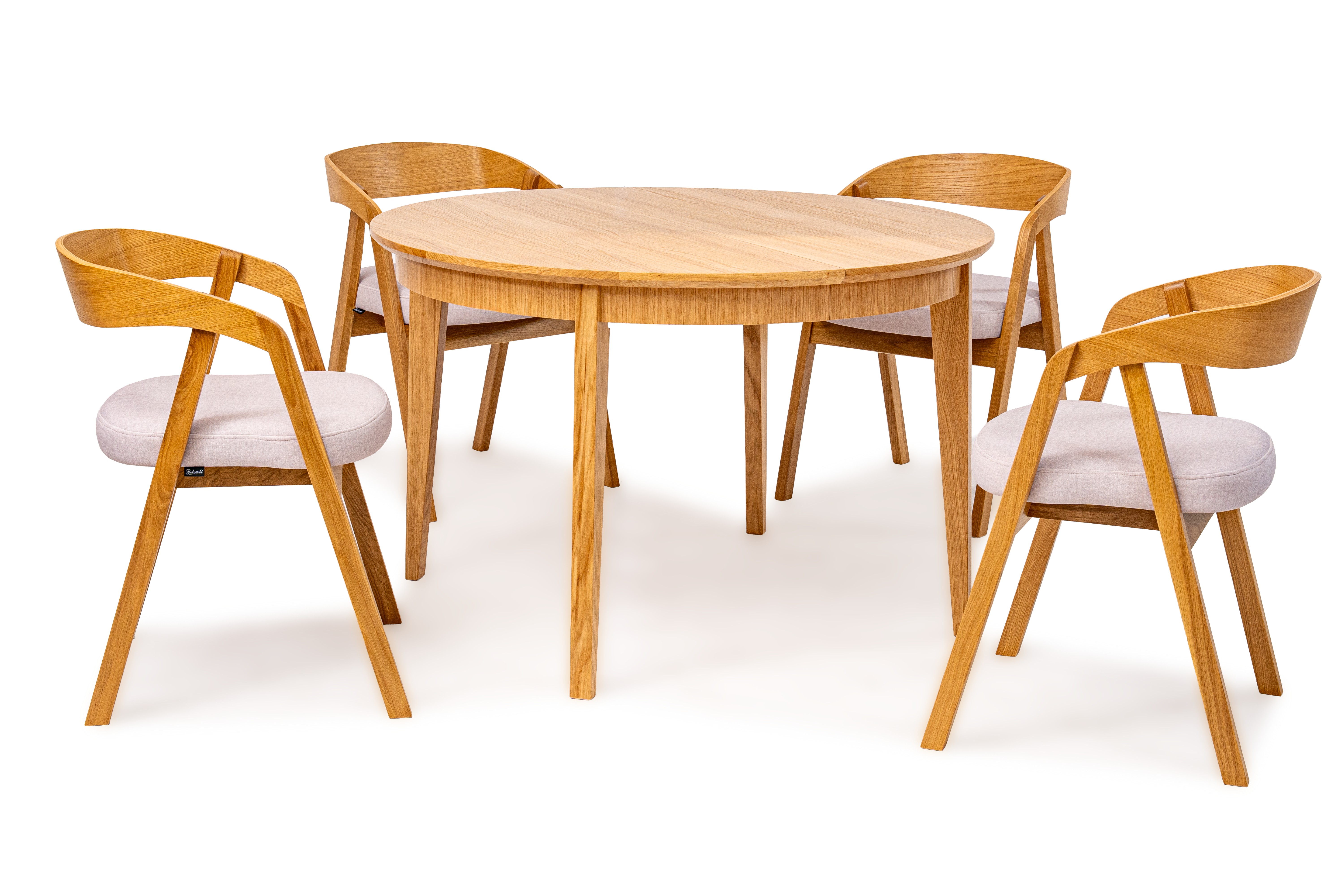 Nogi wykonane są z litego drewna dębowego, natomiast blat z płyty wiórowej okleinowanej naturalną okleiną dębową. Dzięki temu stół jest trwały i odporny na odkształcenia.