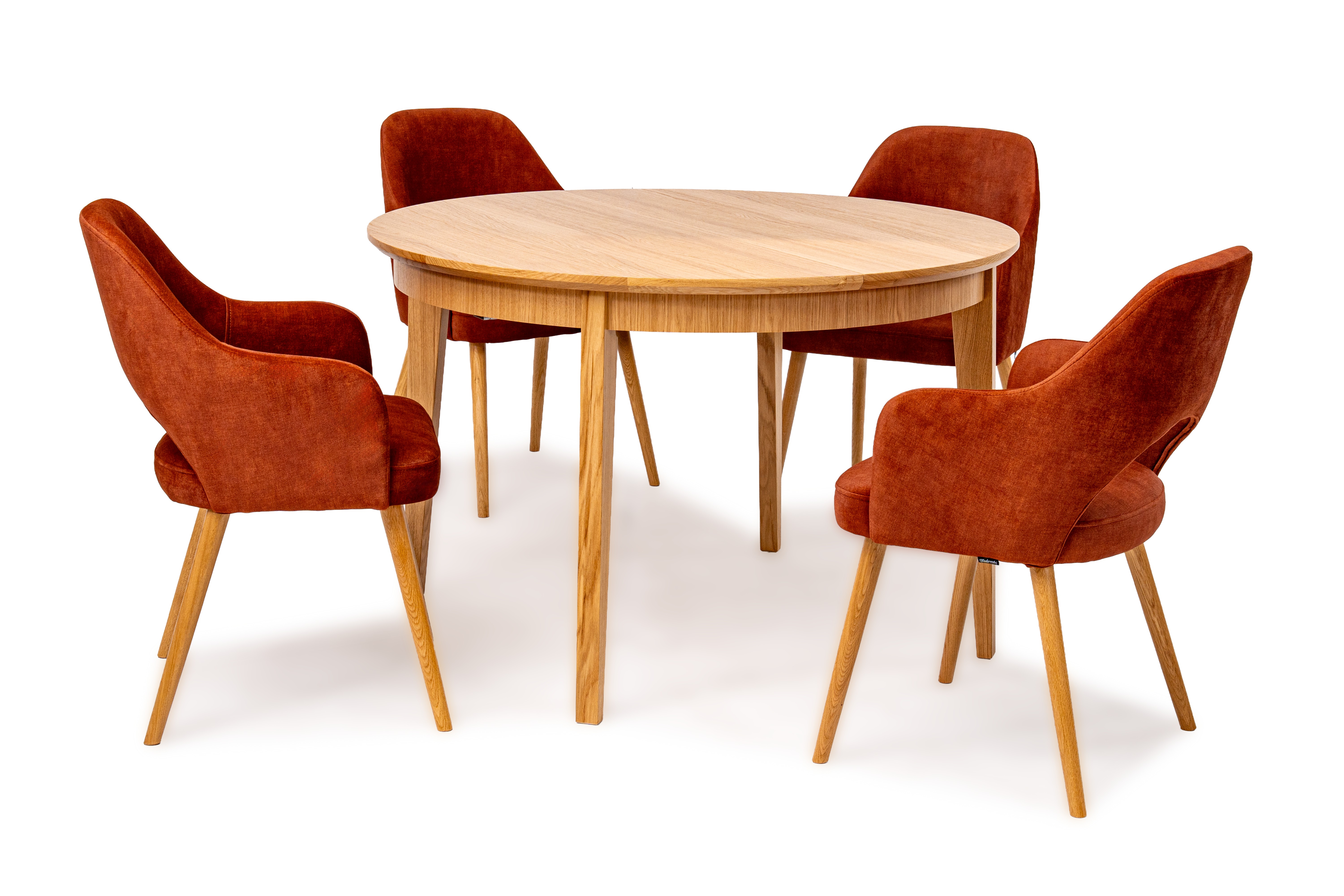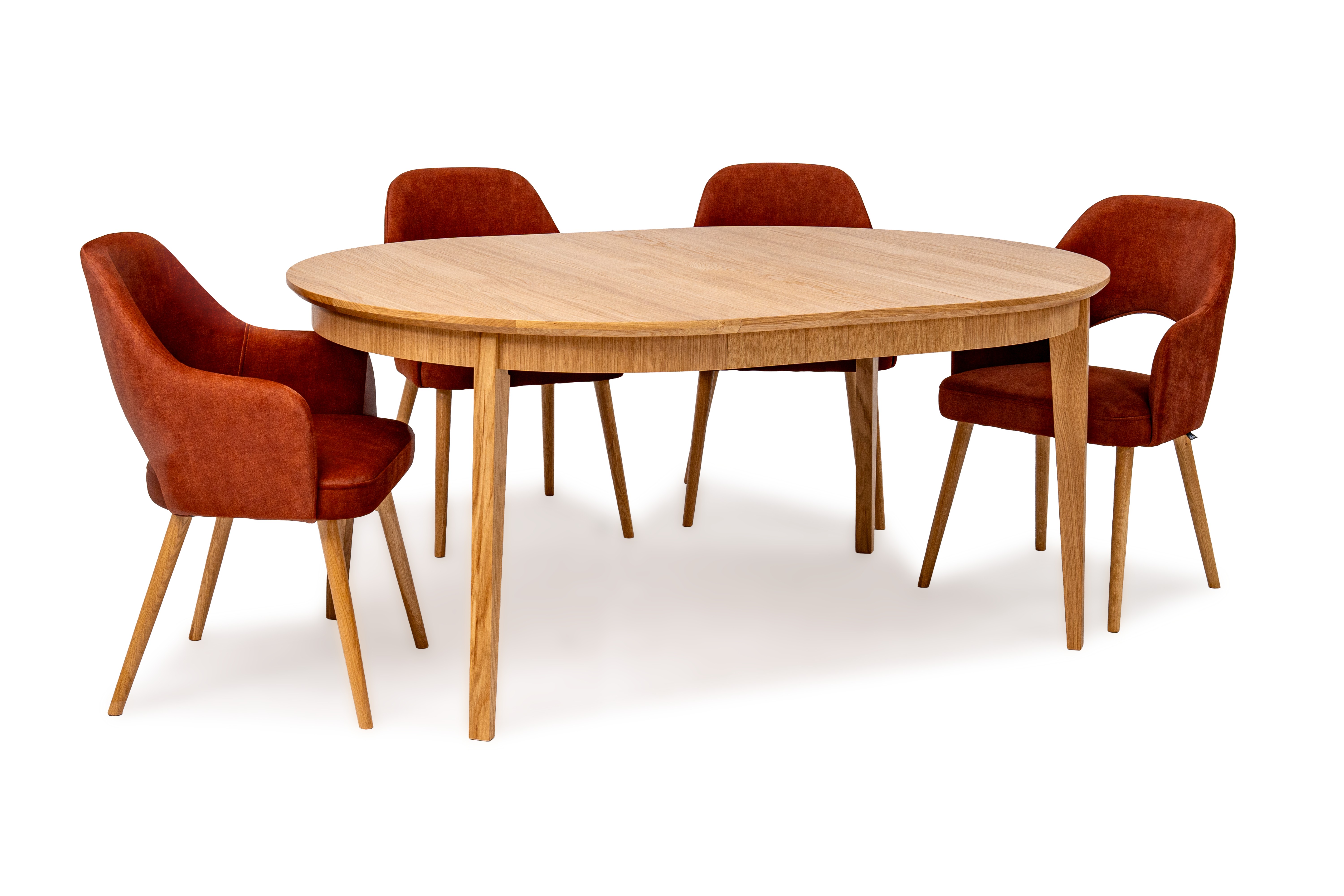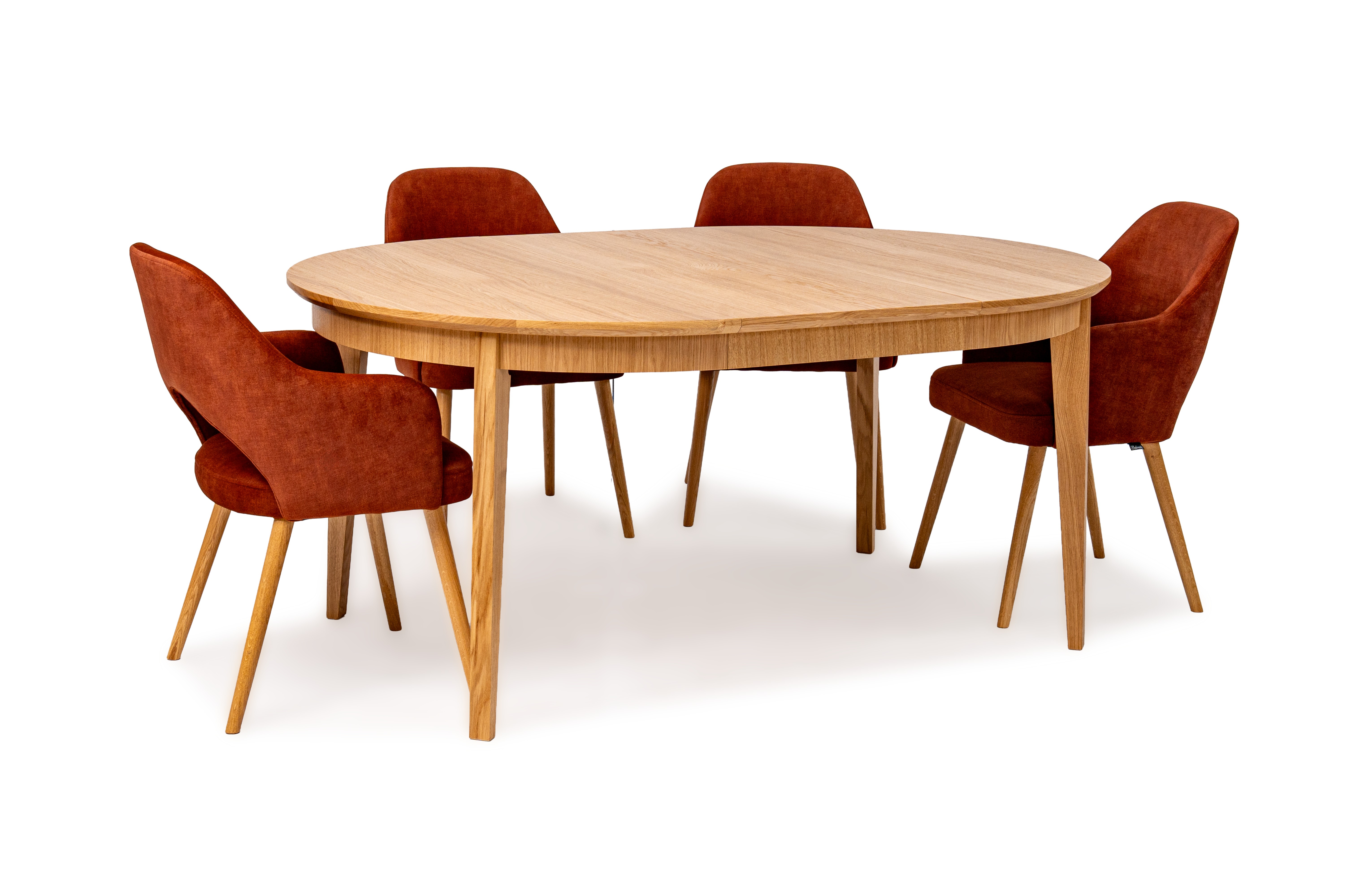 Model VEGA stoi na czterech prostych, solidnych nogach, dzięki czemu jest stabilny i wygodny w użytkowaniu. Blat wykonany został z naturalnej okleiny dębowej, co sprawia, że stół prezentuje się elegancko i naturalnie. Całość produkowana jest w Polsce z dbałością o jakość wykonania, dzięki czemu mebel będzie służył przez długie lata.