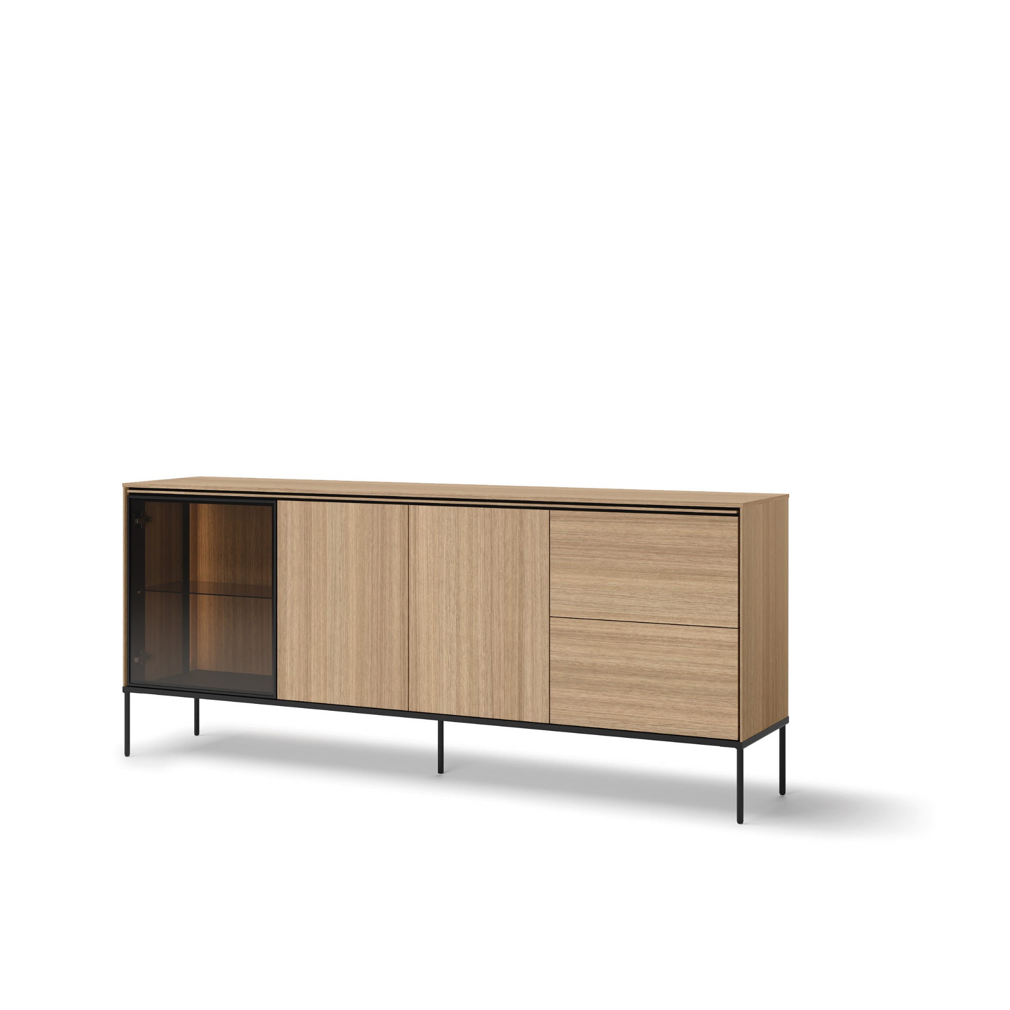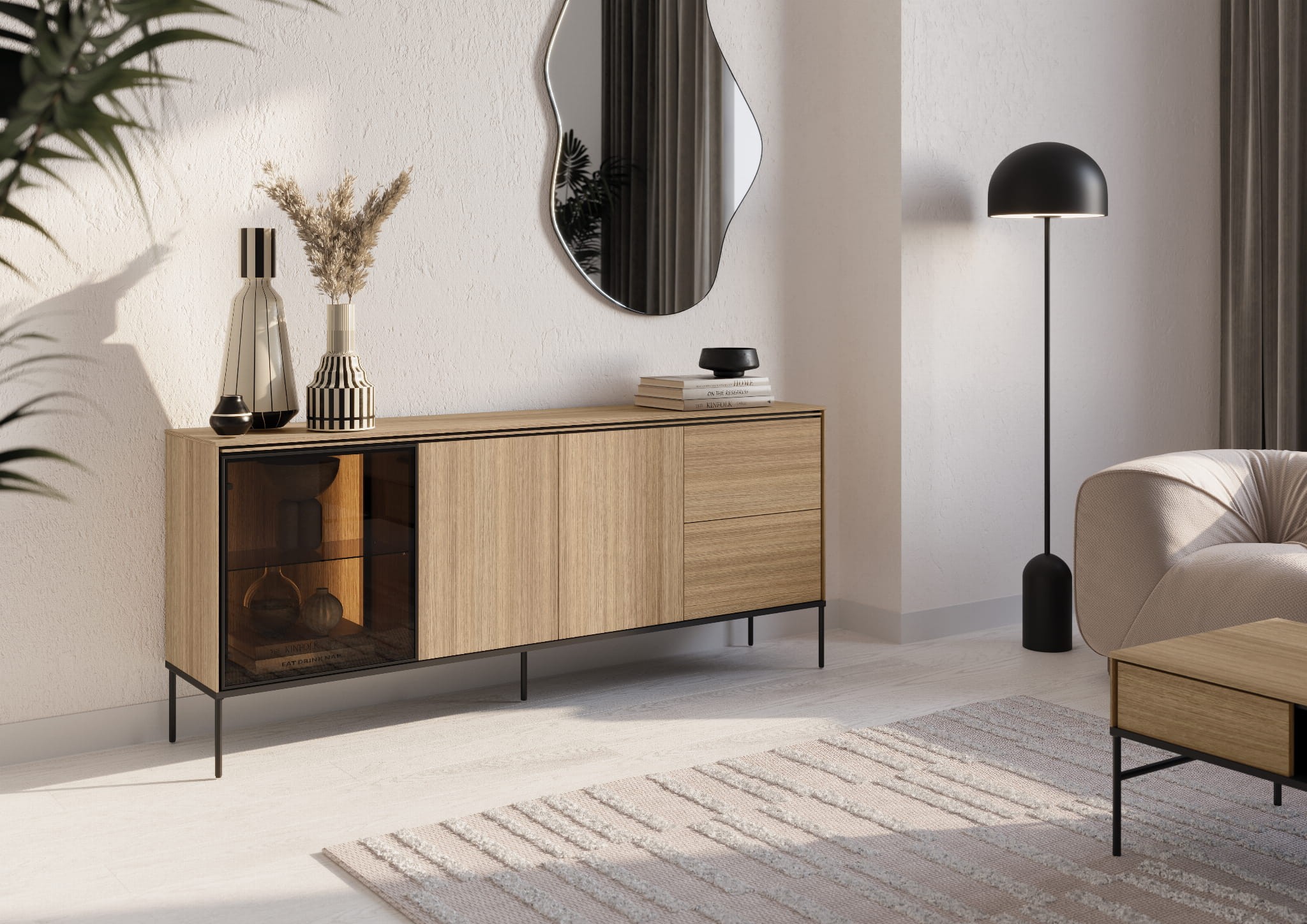 Kolor dębu linearnego w połączeniu z czernią sprawia, że komody doskonale komponują się z każdym wnętrzem, bez względu na styl. Ich uniwersalny design wprowadza ciepło i elegancję.